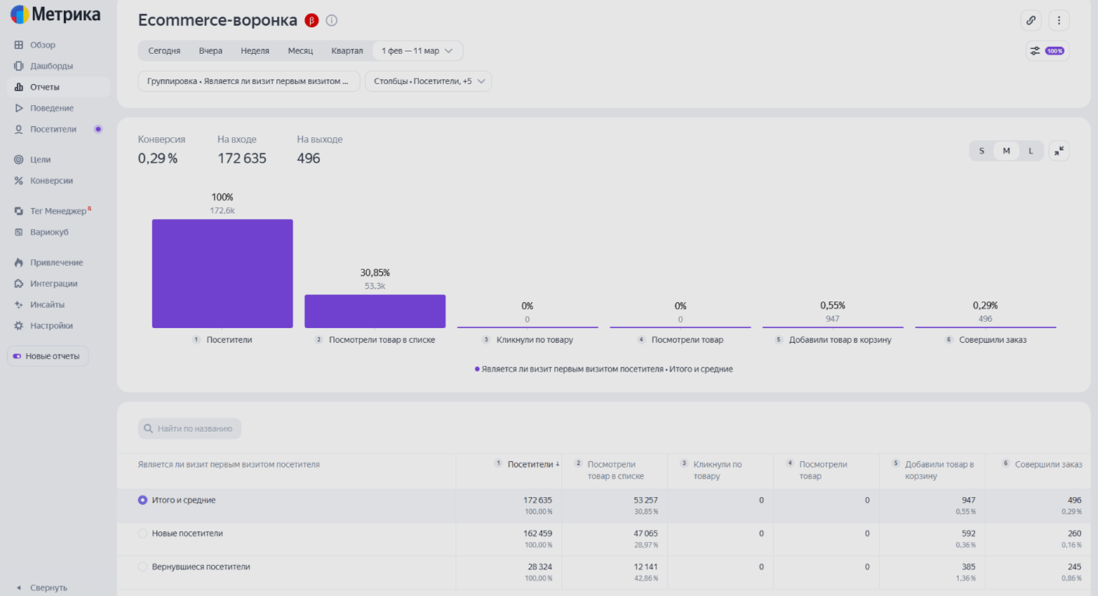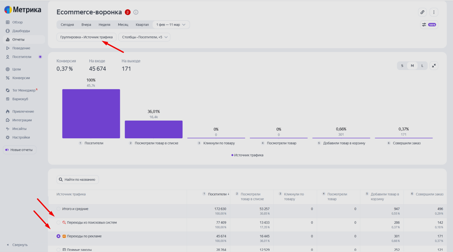 Основной отчёт в этой группе — «Ecommerce-воронка». В нём собраны главные данные, как на дашборде во вкладке «Обзор». «Метрика» формирует воронку и на каждом шаге показывает долю пользователей, дошедших до целевого действия — например, добавления товара в корзину. Отчёт можно посмотреть по каждому источнику трафика. При выборе источника воронка автоматически перестраивается с учётом выбранных данных.