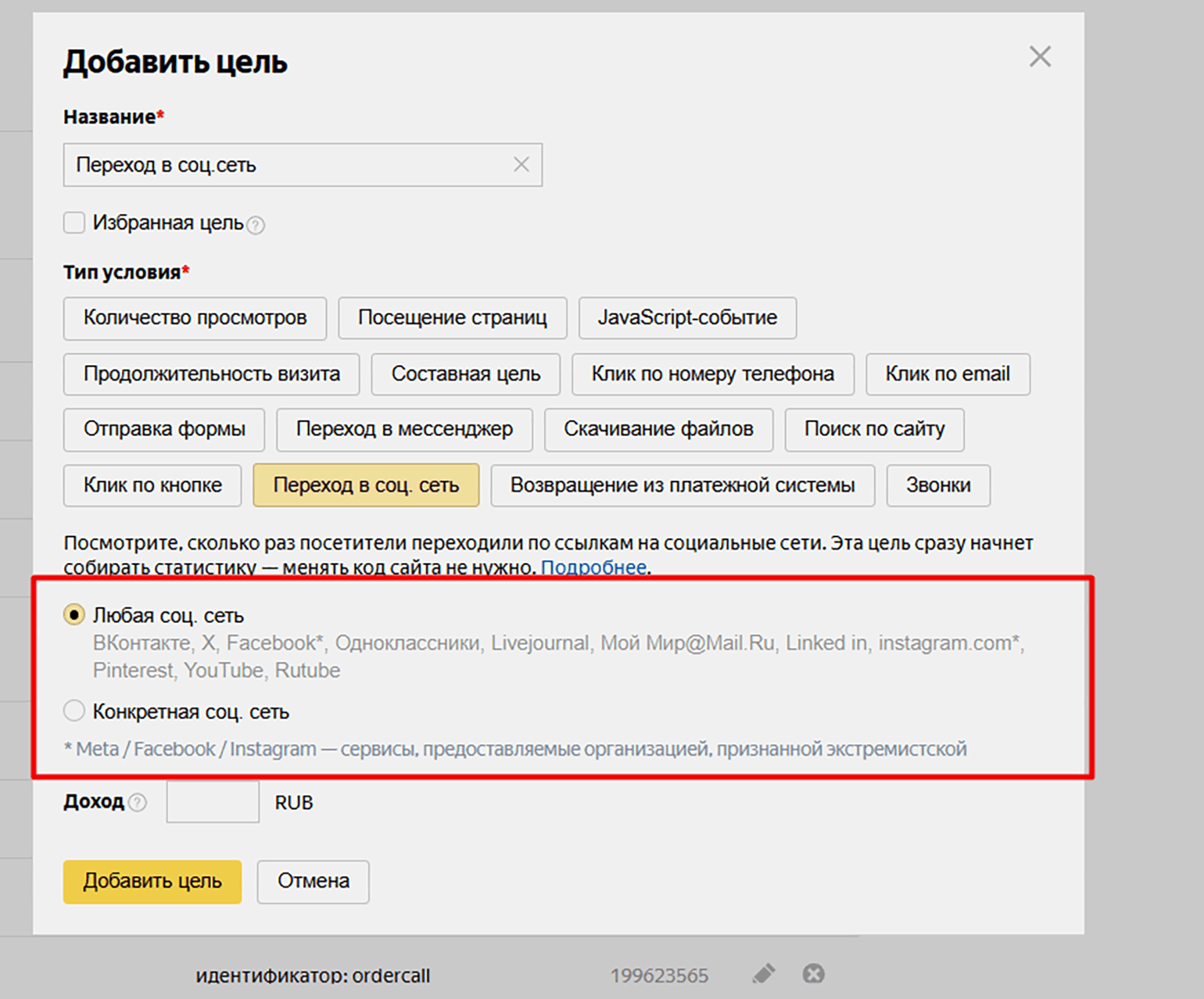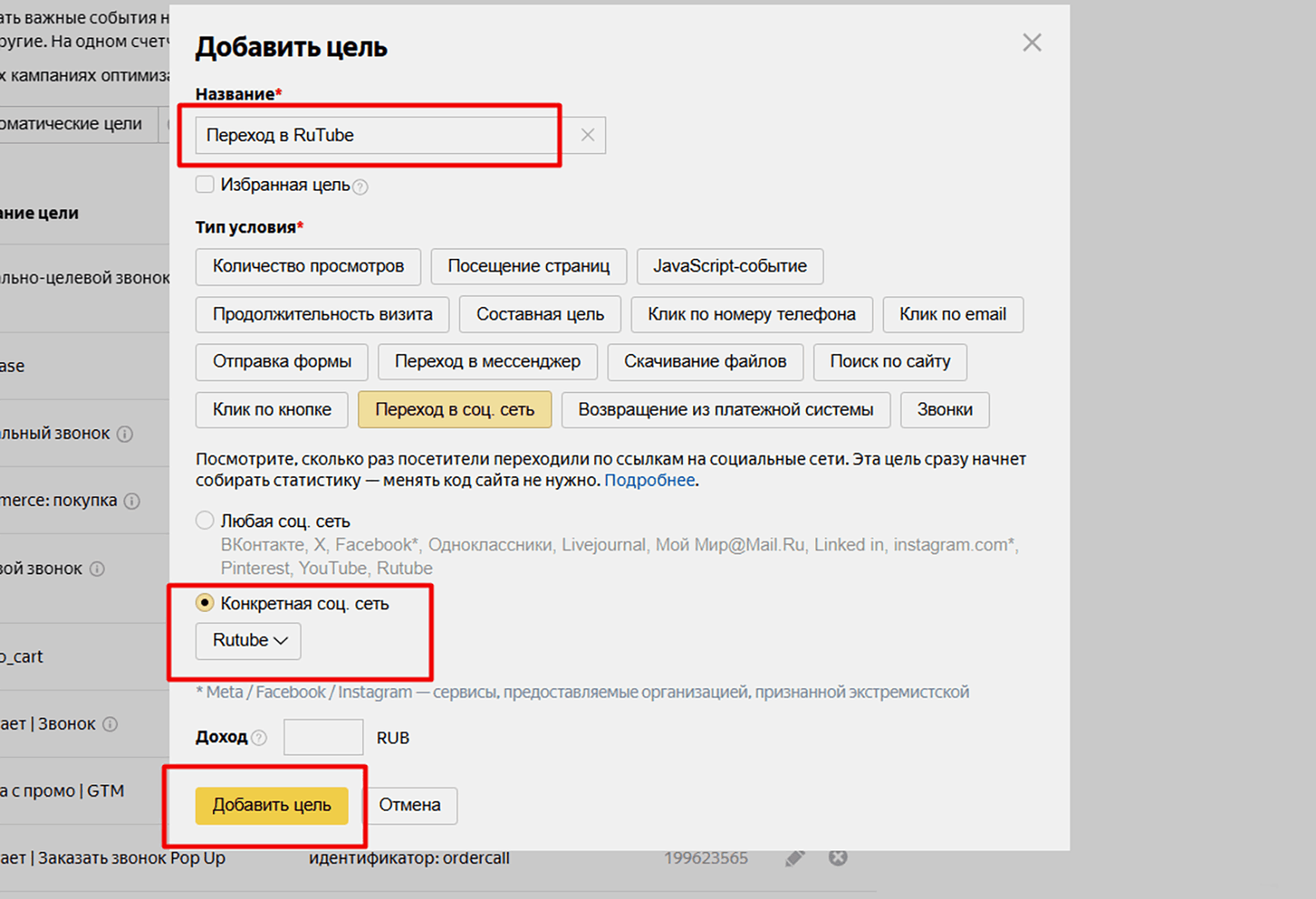 Далее укажите, что именно нужно отслеживать: все социальные сети или какую-то одну. После этого задайте название цели и нажмите «Добавить цель».