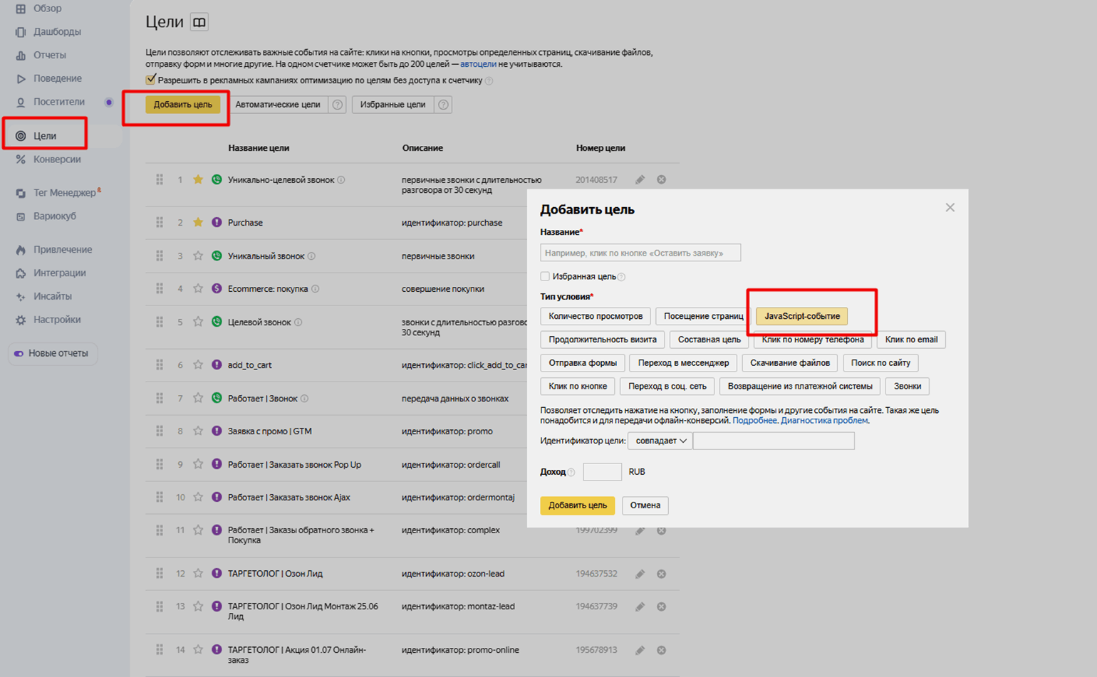 - цели, созданные при интеграции с сервисами, — это цели, данные по которым передаются в «Яндекс Метрику» из внешних систем.