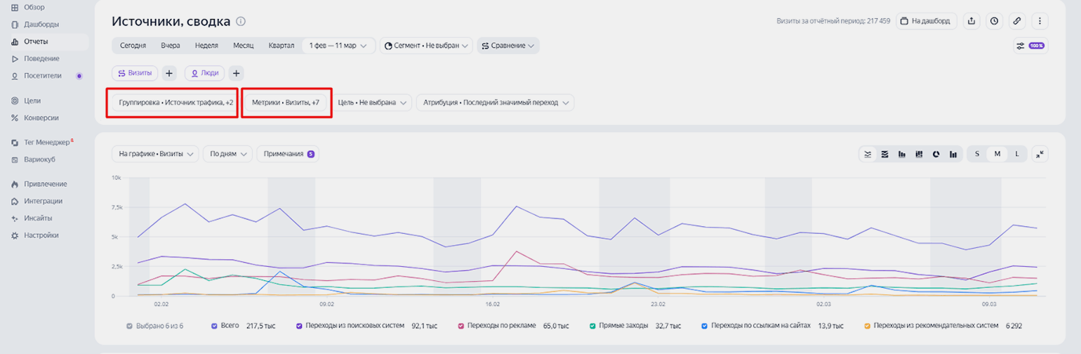 В каждом отчёте — свои логика построения и метрики. Допустим, если нужно проанализировать источники трафика, перейдите в раздел «Отчёты» → «Источники» → «Источники, сводка». Данные в нём можно детализировать по сегментам аудитории, добавлять нужные метрики и отслеживать конверсии.