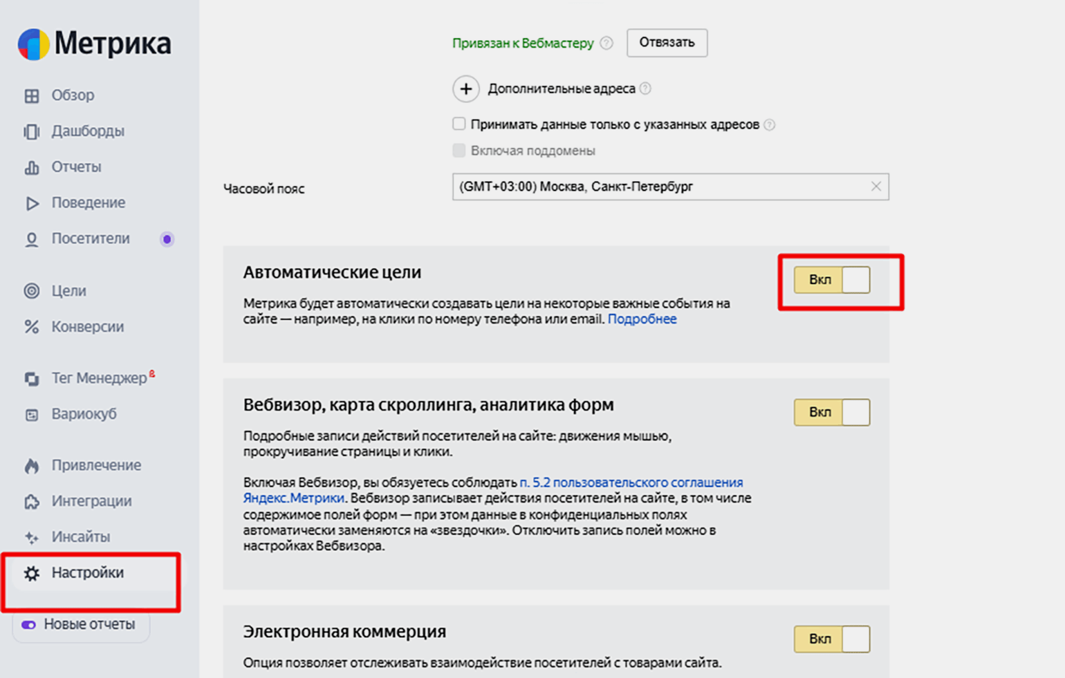 Проще всего включить автоматические цели. Чтобы это сделать, нужно передвинуть соответствующий тумблер в настройках счётчика.