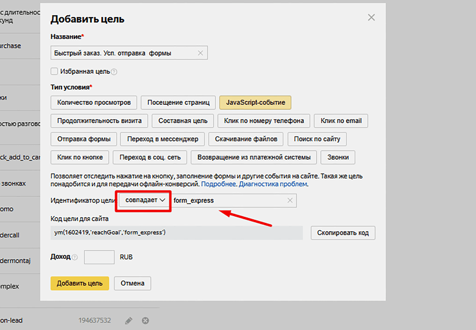 Если вы хотите собрать более точные данные по цели, потребуется вмешательство в код сайта. Для этого выберите тип цели «JavaScript-событие».