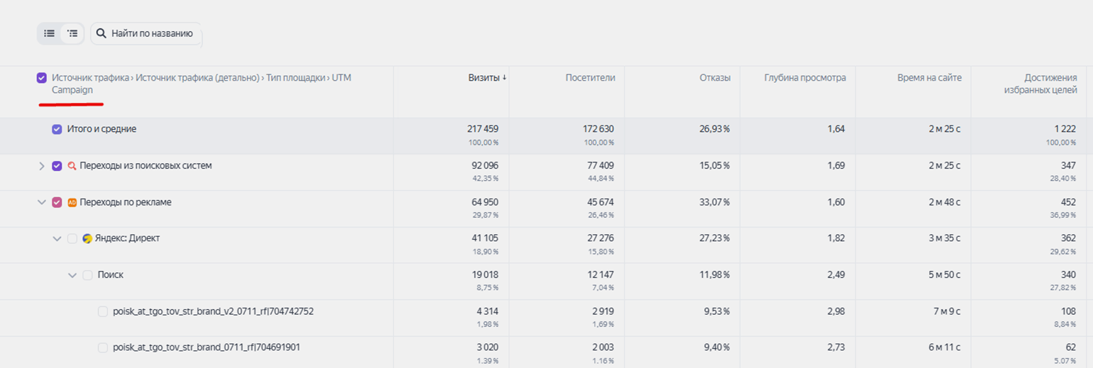 После всех действий данные в отчёте изменились. Теперь можно увидеть не только сколько всего переходов по рекламе было и из каких поисковых систем, но и какие кампании принесли больше переходов, а какие — меньше.