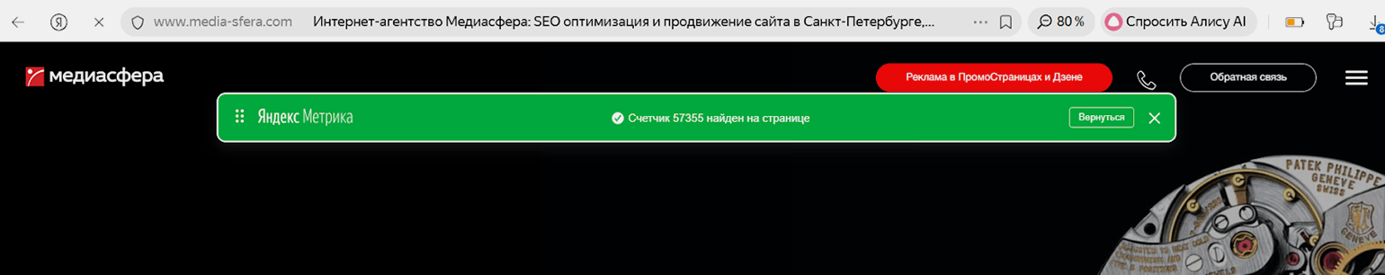 После этого откроется сайт и, если счётчик размещён корректно, появится соответствующее сообщение. Если счётчик не установлен или установлен с ошибкой, всплывающего окна не будет.