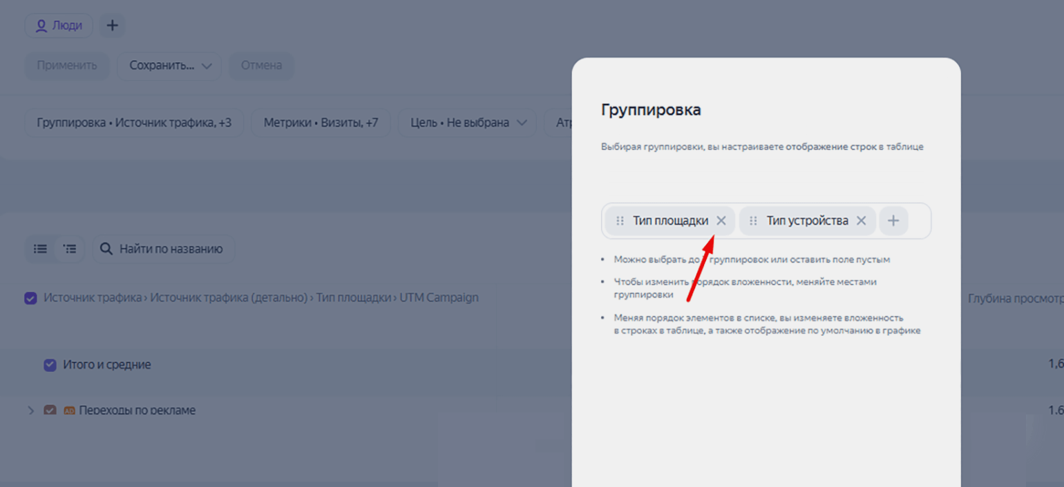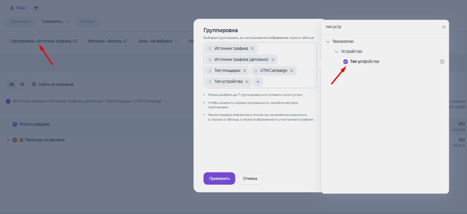 Разберём ещё одну ситуацию: нам нужно узнать, с каких устройств пользователи, пришедшие с рекламы, совершают покупки. Для этого откройте «Группировки» и добавьте «Тип устройств». Остальные группировки удалите, кликнув на крестики справа от их названий.