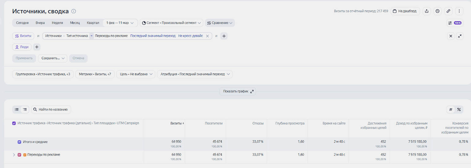 После применения фильтра все остальные данные в отчётах показываться не будут. Можно будет работать только с информацией о переходах по рекламе.