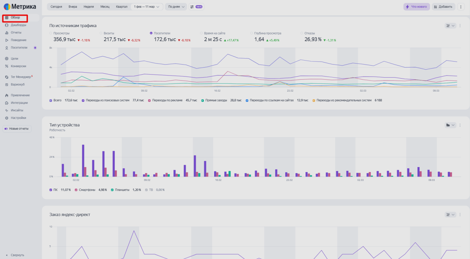 Основные показатели можно посмотреть в дашборде. Чтобы открыть его, нажмите на вкладку «Обзор» в левом меню.