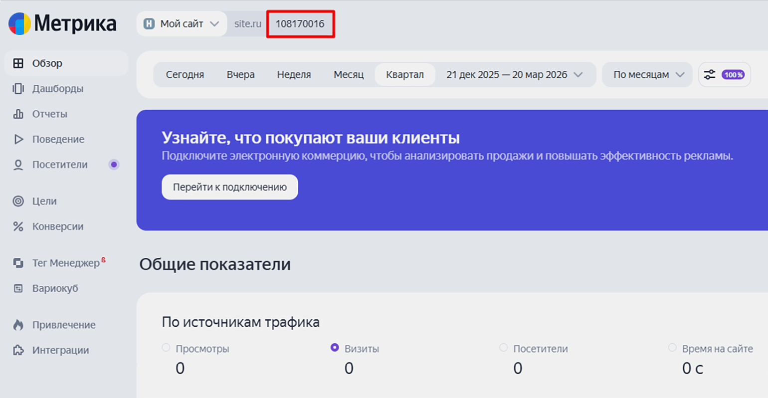 Номер счётчика указан на каждой странице отчёта в «Яндекс Метрике», а также в блоке с настройками.
