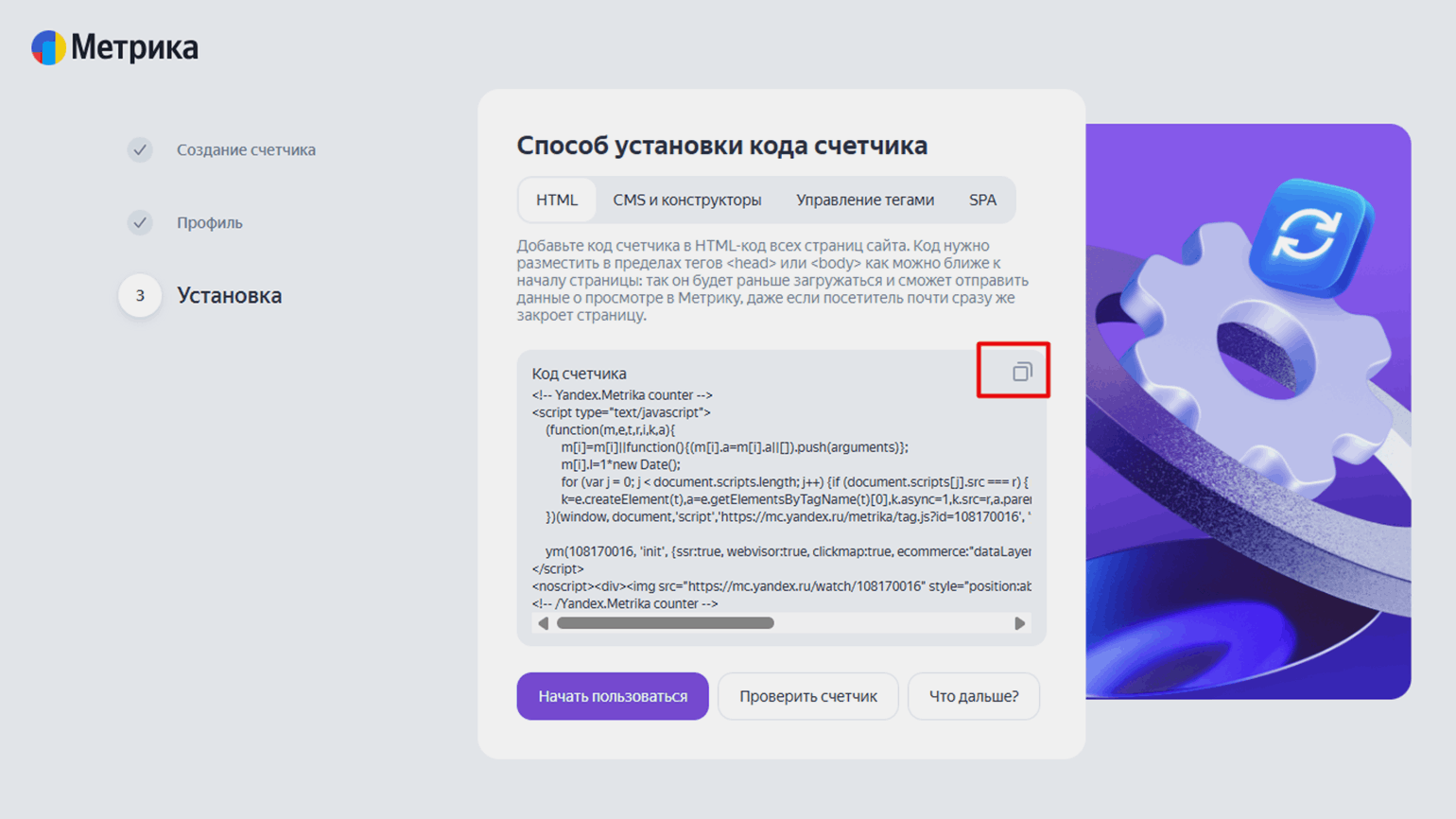 На шаге «Установка» вы получите код счётчика и инструкцию по его установке. Скопируйте этот код и перейдите в шаблон своего проекта.