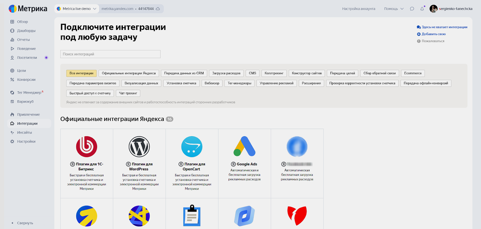 - «Яндекс Метрику» можно интегрировать с CRM, рекламными системами и другими сервисами. Это помогает отслеживать путь пользователя от первого визита до покупки. Благодаря этому бизнес получает представление об эффективности сайта и рекламных кампаний.