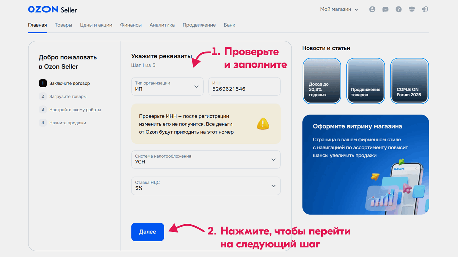 Важно! Для самозанятых есть ограничение — доход не должен превышать 2,4 миллиона рублей в год. Если вы превысите лимит, ФНС автоматически снимет вас с учёта. Тогда придётся стать индивидуальным предпринимателем, а после создать новый кабинет на Ozon. Изменить статус в старом кабинете не получится.
