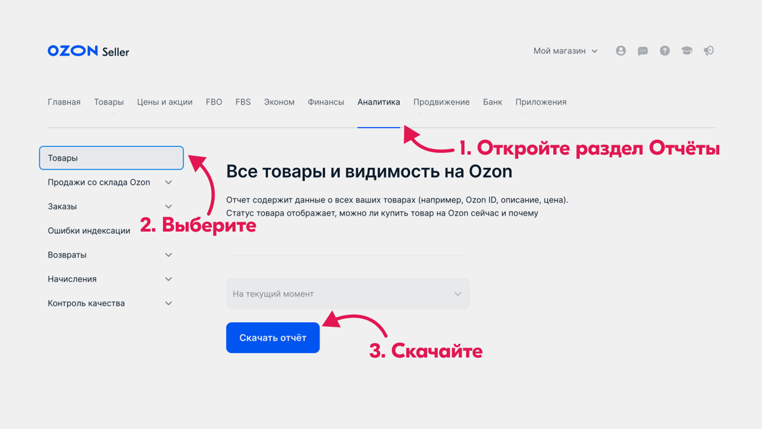 Ozon — самый открытый в плане аналитики мультикатегорийный маркетплейс. Все данные, полезные для селлеров, собраны в разделе «Аналитика». В нём больше десяти подразделов. Здесь мы поговорим про пять из них: «Графики», «Кластеры», «Где товары в поиске», «Отчёты» и «Что продавать на Ozon». Подробнее об аналитике на площадке можно почитать в базе знаний Ozon.