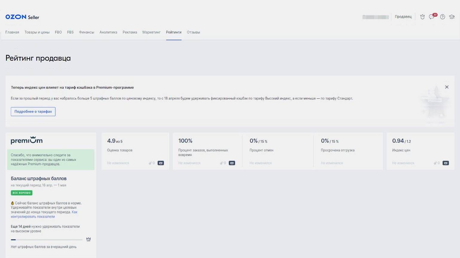 Рейтинг продавца — метрика, которая видна покупателям на странице магазина. Показатель учитывает оценку товара, индекс цен, процент заказов, выполненных вовремя, процент отмен и просроченные отгрузки.