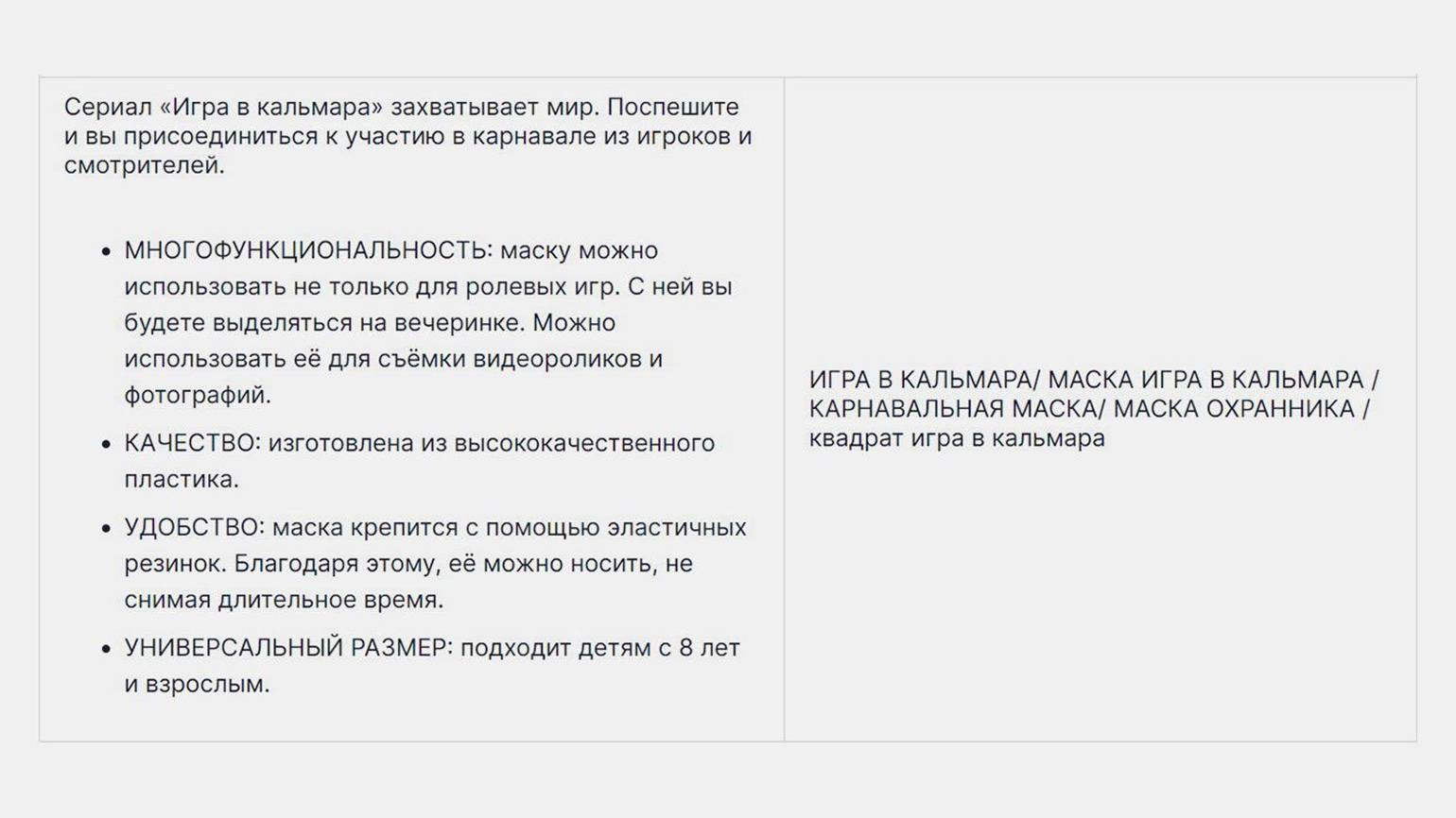 Описание индексируется, поэтому в него тоже нужно добавить ключевые слова. Но помните о рекомендации маркетплейса: «Текстовая аннотация должна быть информативной, раскрывать все свойства товара и отвечать на возможные вопросы покупателей. Там нужно рассказать главное о товаре: что это, как, где и для чего используется, из чего сделано и какие имеет особенности».