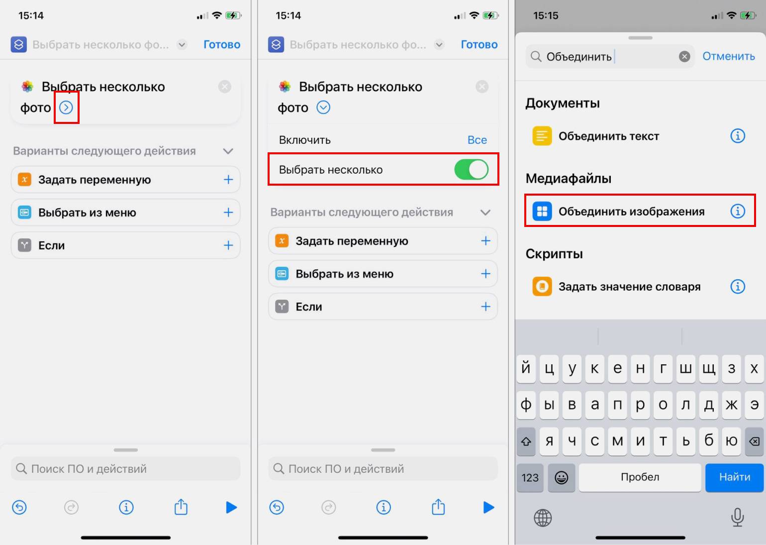 Нажмите на голубую стрелочку возле команды — откроется меню. Передвиньте вправо переключатель «Выбрать несколько», чтобы можно было использовать несколько фото. Далее в поисковой строке введите запрос «Объединить изображения» и добавьте соответствующую команду, просто кликнув на неё.