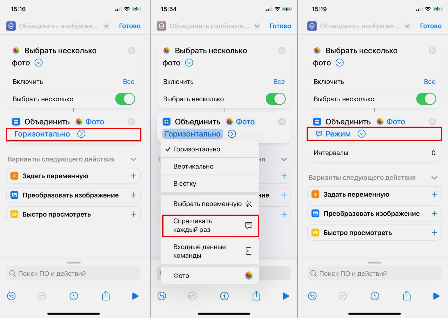 В блоке «Объединить» нажмите на параметр «Горизонтально». В появившемся меню выберите «Спрашивать каждый раз». Благодаря этой настройке вы сможете выбирать, какой коллаж хотите сделать: горизонтальный, вертикальный или в сетке.