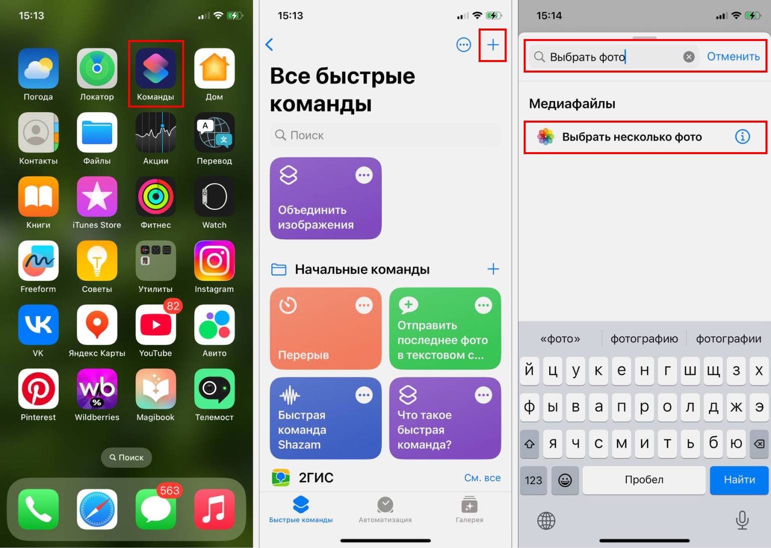 Для этого откройте приложение «Команды» и создайте новое действие. Нажмите на плюс в верхнем правом углу, в строке поиска введите «Выбрать фото» и ниже выберите опцию «Выбрать несколько фото».