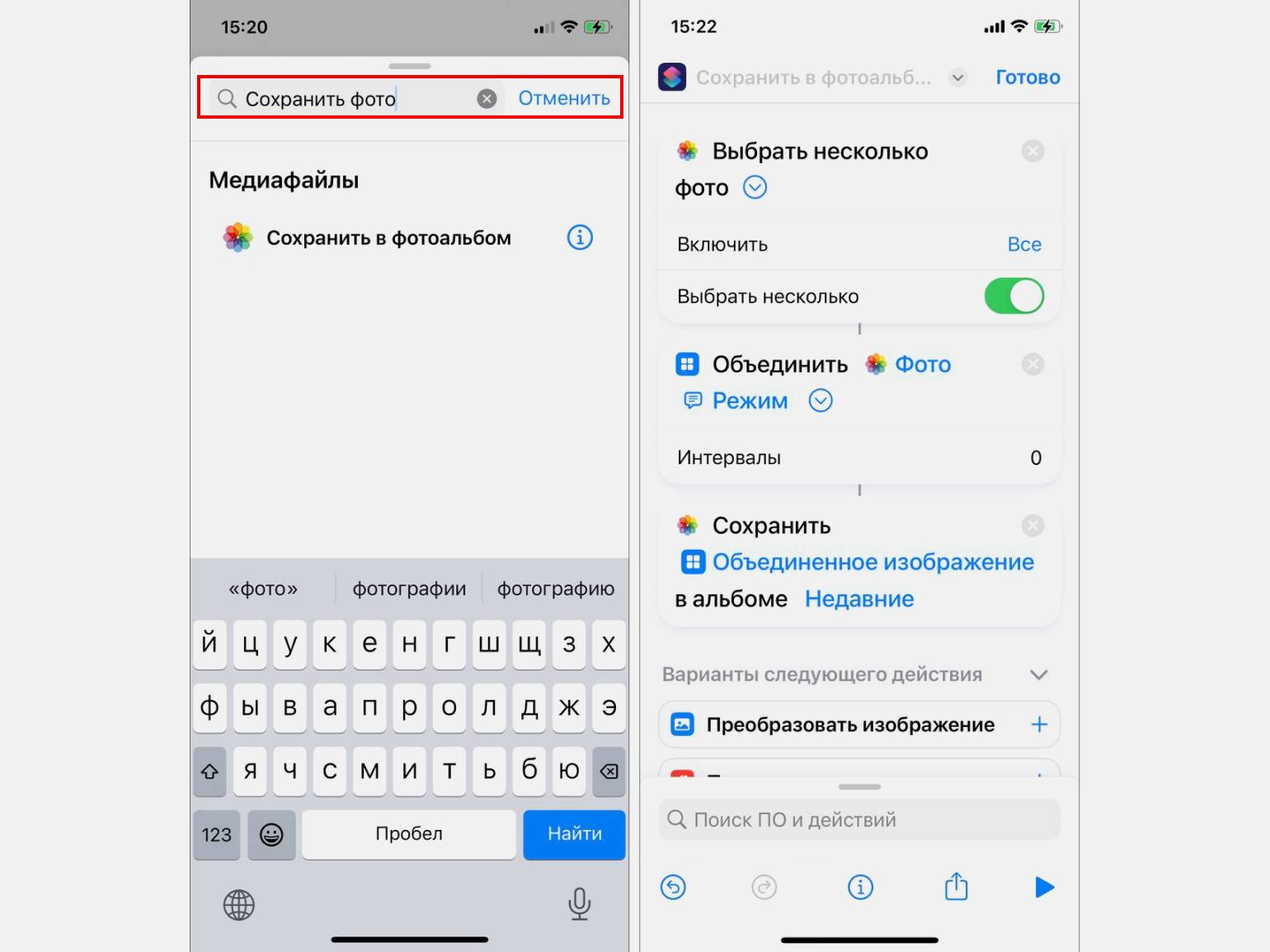 Далее снова введите в поисковую строку «Сохранить в фото». В списке появится действие «Сохранить в фотоальбом» — выберите его. В итоге у вас должна получиться такая команда.