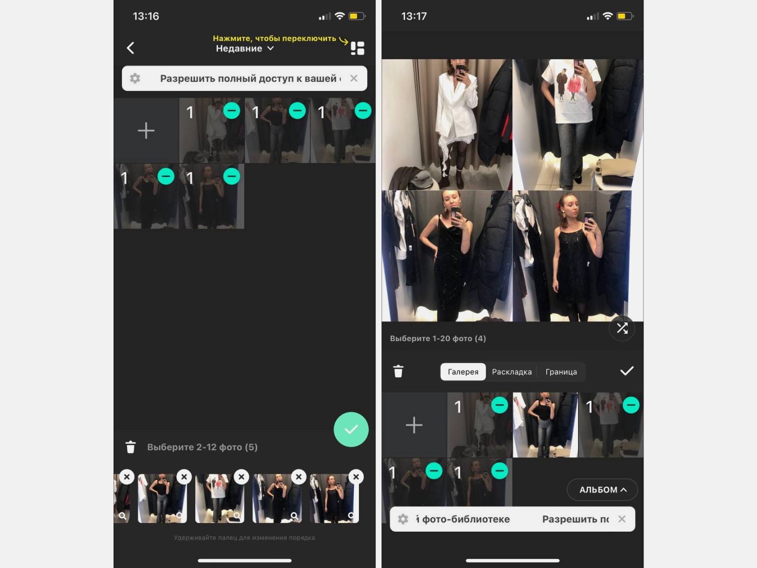 Сначала изображения появятся в приложении. Из них выберите от 2 до 12 снимков и нажмите на них.