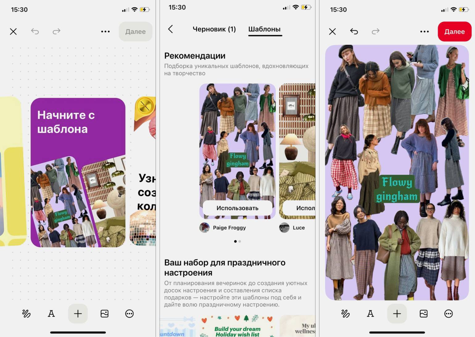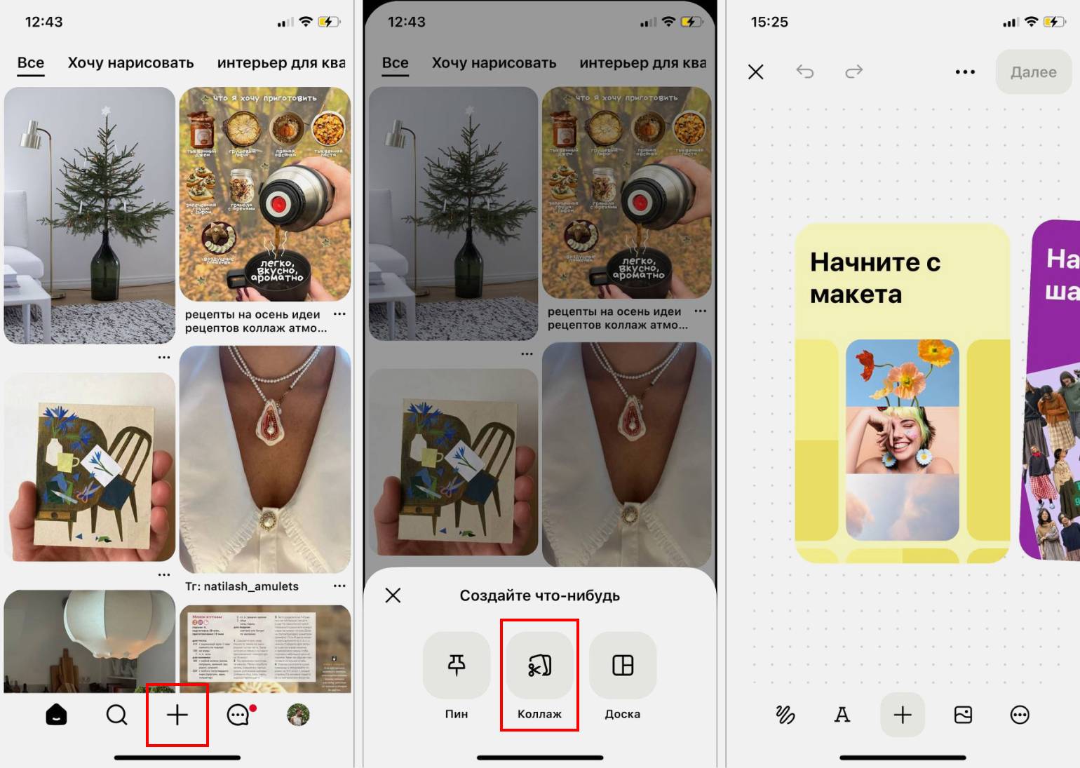 Pinterest. Чтобы создать коллаж в Pinterest, откройте приложение и нажмите на плюсик в нижней части экрана. Появится меню с вариантами действий — выберите пункт «Коллаж». Далее вы увидите экран с пинами. Свайпните его вниз, чтобы появилось рабочее поле. После этого вы увидите действие «Начните с макета». Нажмите на него.