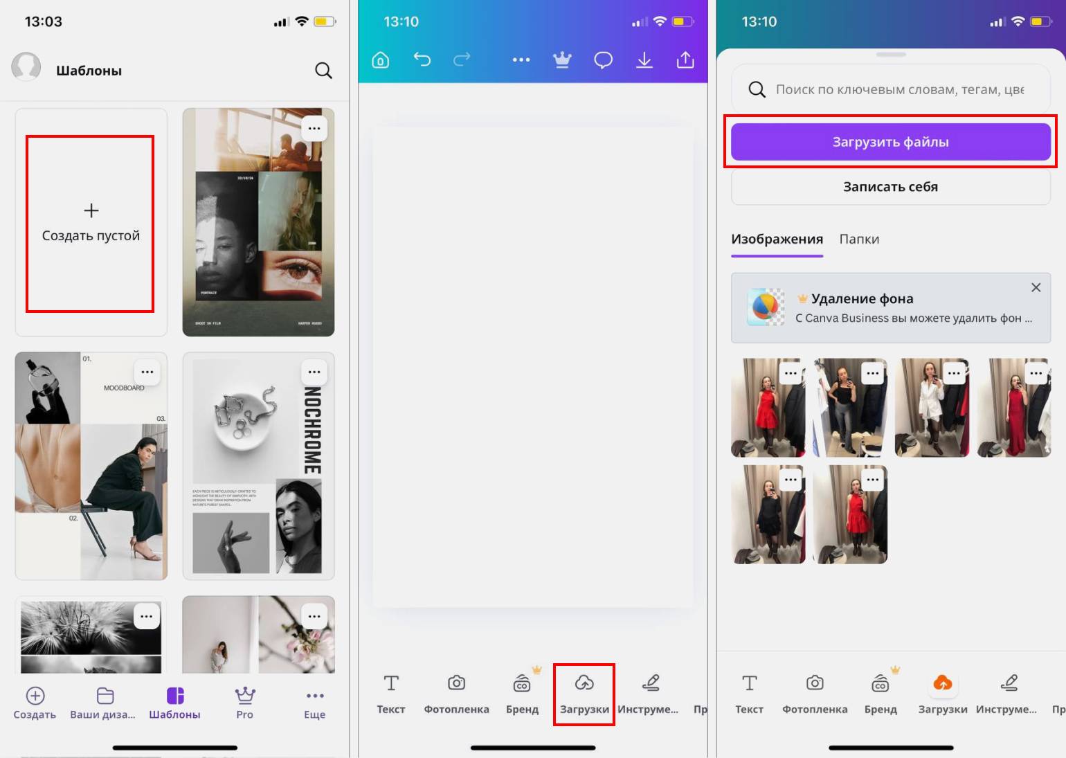 Коллаж можно собрать и вручную. Для этого выберите функцию «Создать пустой» — откроется чистое рабочее поле. В нижнем меню найдите кнопку «Загрузки» → «Загрузить файлы». Затем выберите нужные файлы в галерее и нажмите на кнопку «Готово» в верхней части экрана. После этого выбранные фотографии появятся в разделе «Загрузки».