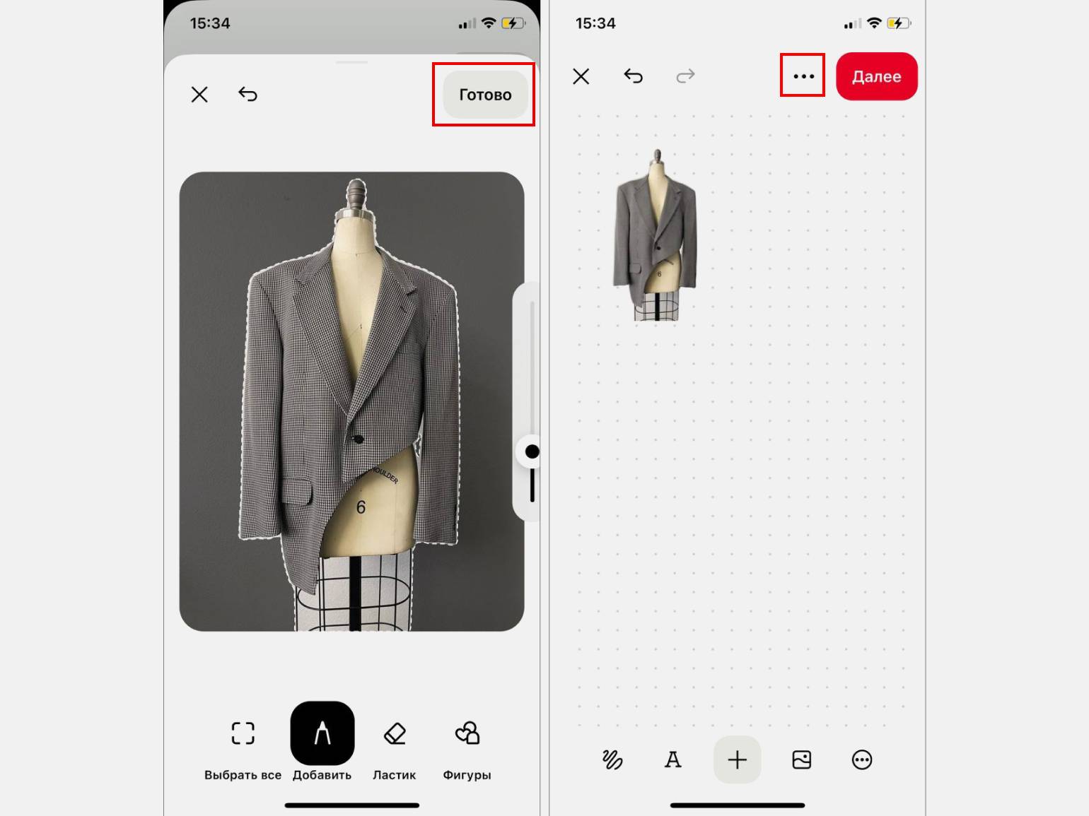 Если не устраивает, как обрезано изображение, то нажмите «Добавить» или «Ластик», чтобы изменить контур обрезки. Затем нажмите «Готово». Обрезанная картинка появится на рабочем поле. Когда всё будет готово, снова нажмите на три точки рядом с кнопкой «Далее» и выберите «Скачать изображение».