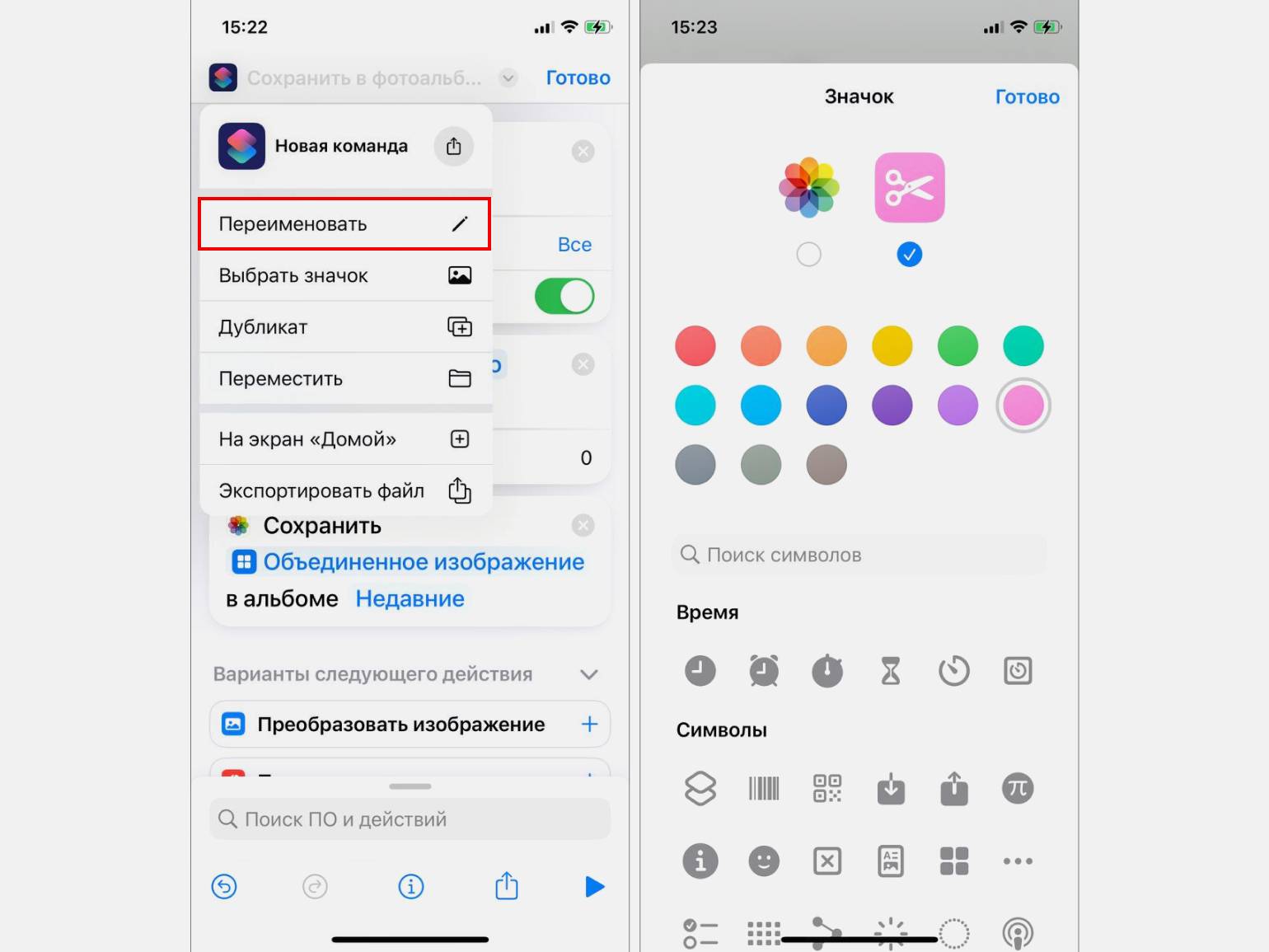 Теперь давайте переименуем команду и выберем для неё другой значок, чтобы она визуально выделялась среди остальных. Чтобы переименовать команду, кликните на её название. Появится меню, в нём выберите строку с названием «Переименовать». Далее введите новое название, например «Коллаж». После ввода нажмите «Готово» на клавиатуре.