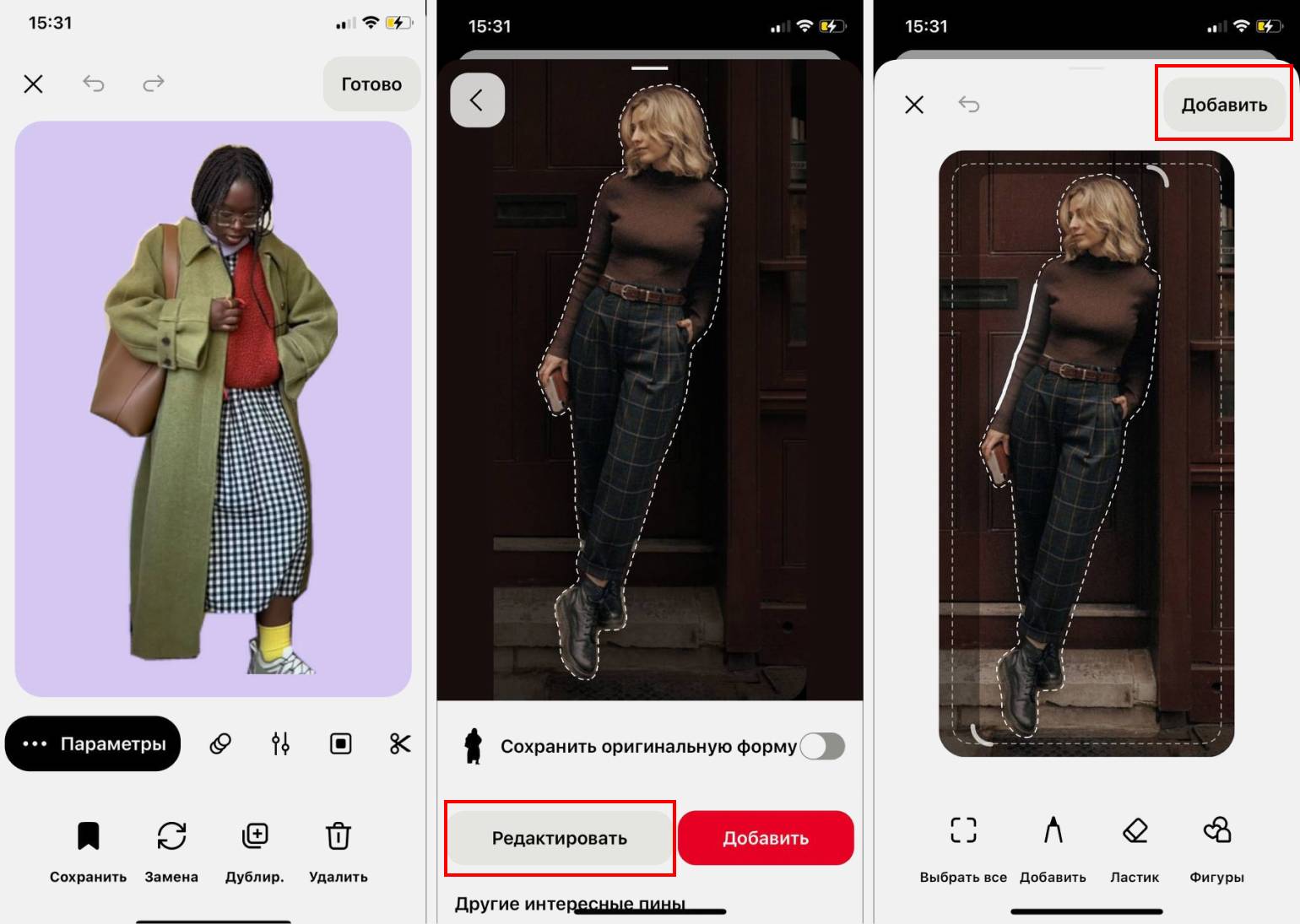 Если обрезка кажется неудачной, нажмите «Редактировать» и вручную скорректируйте контур с помощью инструментов «Добавить» или «Ластик». Если всё устраивает, нажмите на кнопку «Добавить» в правом верхнем углу. Когда закончите, нажмите на три точки в верхней части экрана → «Скачать изображение».