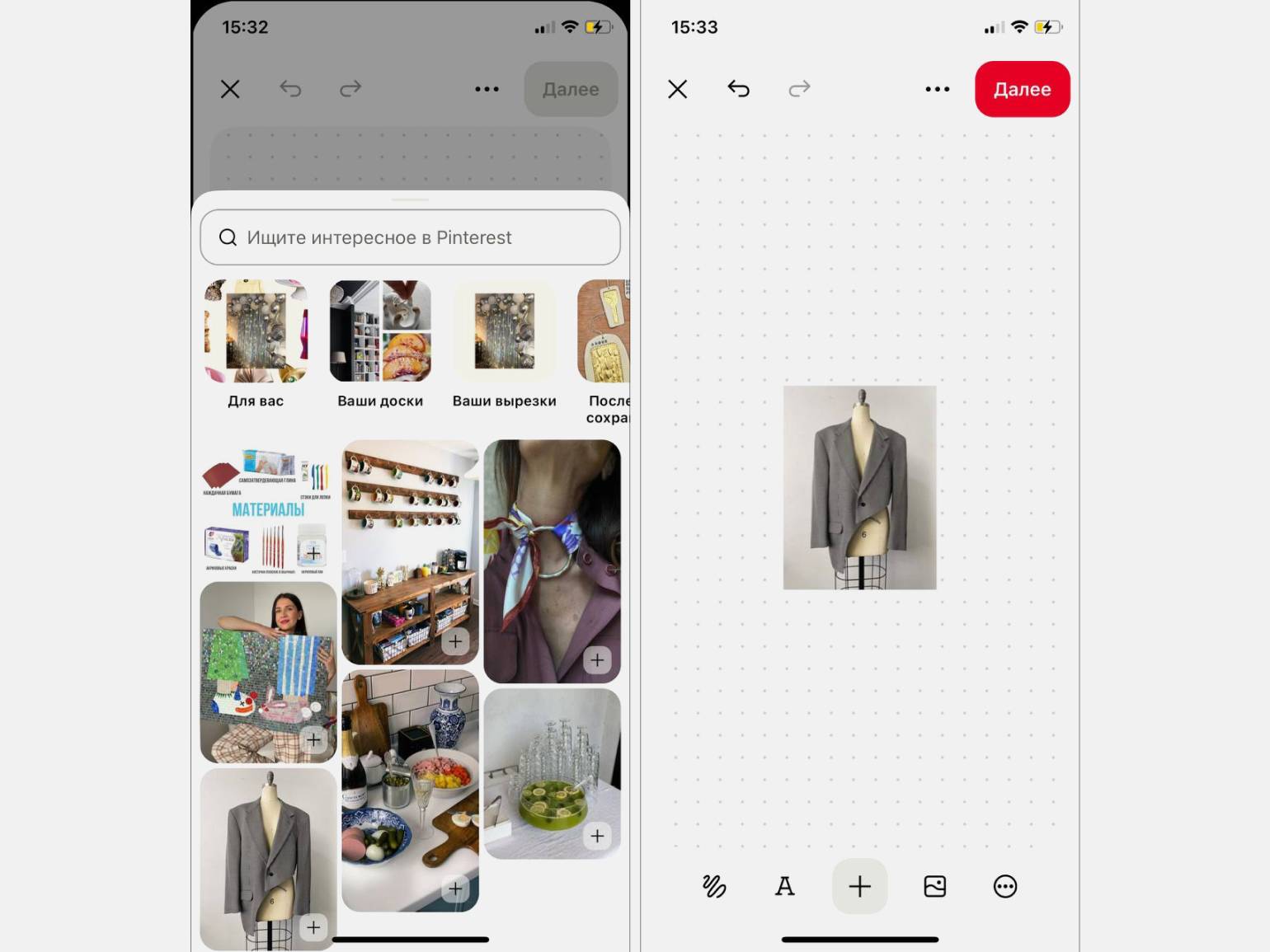 Есть и третий вариант — создать коллаж вручную. Для этого откройте редактор коллажа и нажмите на плюсик внизу. Выберите нужный пин — он появится на рабочем поле.
