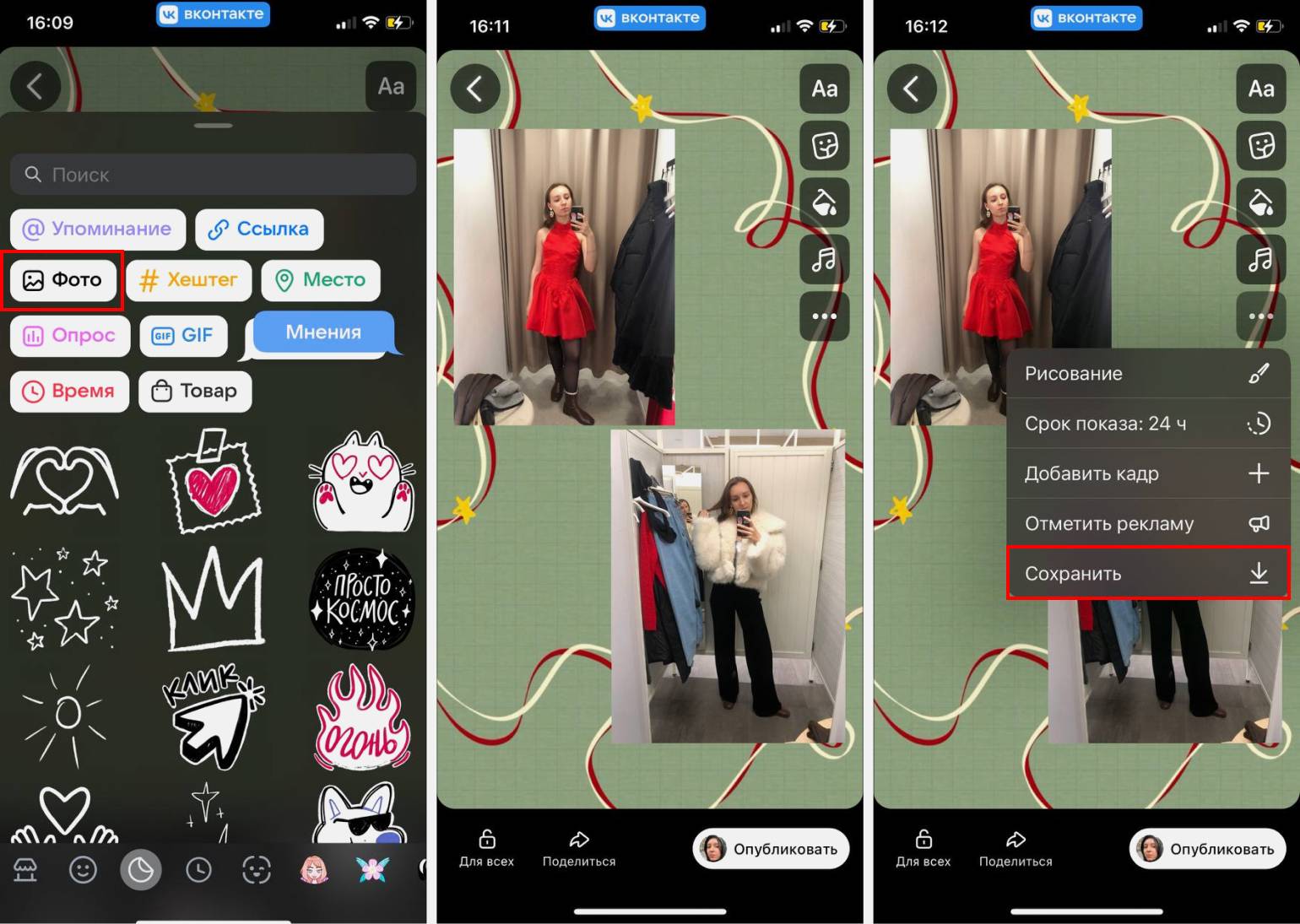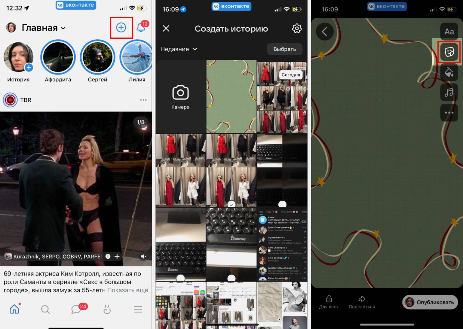 «ВКонтакте». Здесь также можно собрать коллаж в истории. Для начала скачайте фон для коллажа — на него вы будете добавлять фотографии. Нажмите на плюсик рядом с вашей историей и выберите из галереи подготовленный фон.