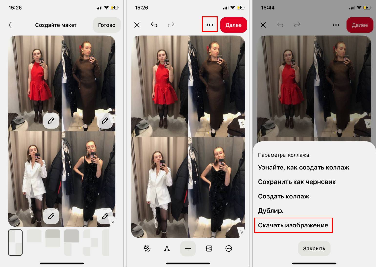 После этого вы можете добавить на коллаж текст, рисунки или дополнительные изображения — все инструменты находятся в нижнем меню. Если правки больше не нужны, сохраните работу: нажмите на три точки рядом с кнопкой «Далее» и выберите «Скачать изображение».