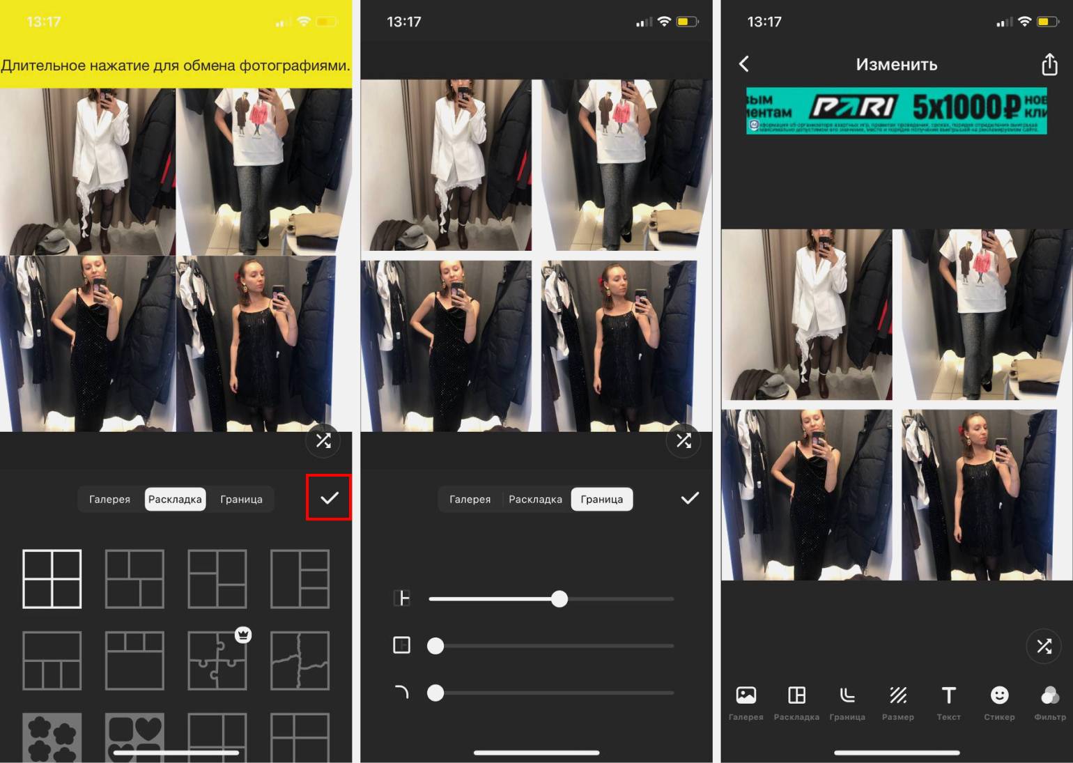 После выбора фотографий перед вами появится сам коллаж. Можно его настроить: поменять раскладку в меню «Раскладка», изменить расстояние между фотографиями, добавить рамку или скруглить углы в разделе «Границы».