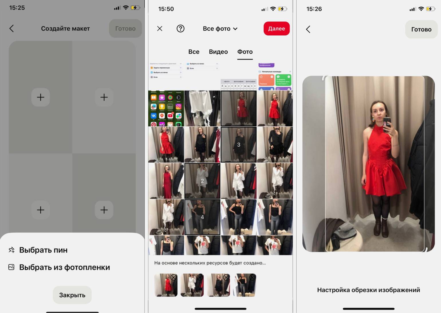 Далее перед вами откроется несколько шаблонов коллажа. Мы выбрали самый первый. После того как макет откроется, нажмите на плюсик в середине серой ячейки — теперь можно выбрать фотографии из своих пинов или загрузить их из галереи. При необходимости обрежьте изображение, а затем нажмите «Готово» в правом верхнем углу. Повторите эти действия для всех ячеек макета. Когда заполните шаблон, снова нажмите «Готово».