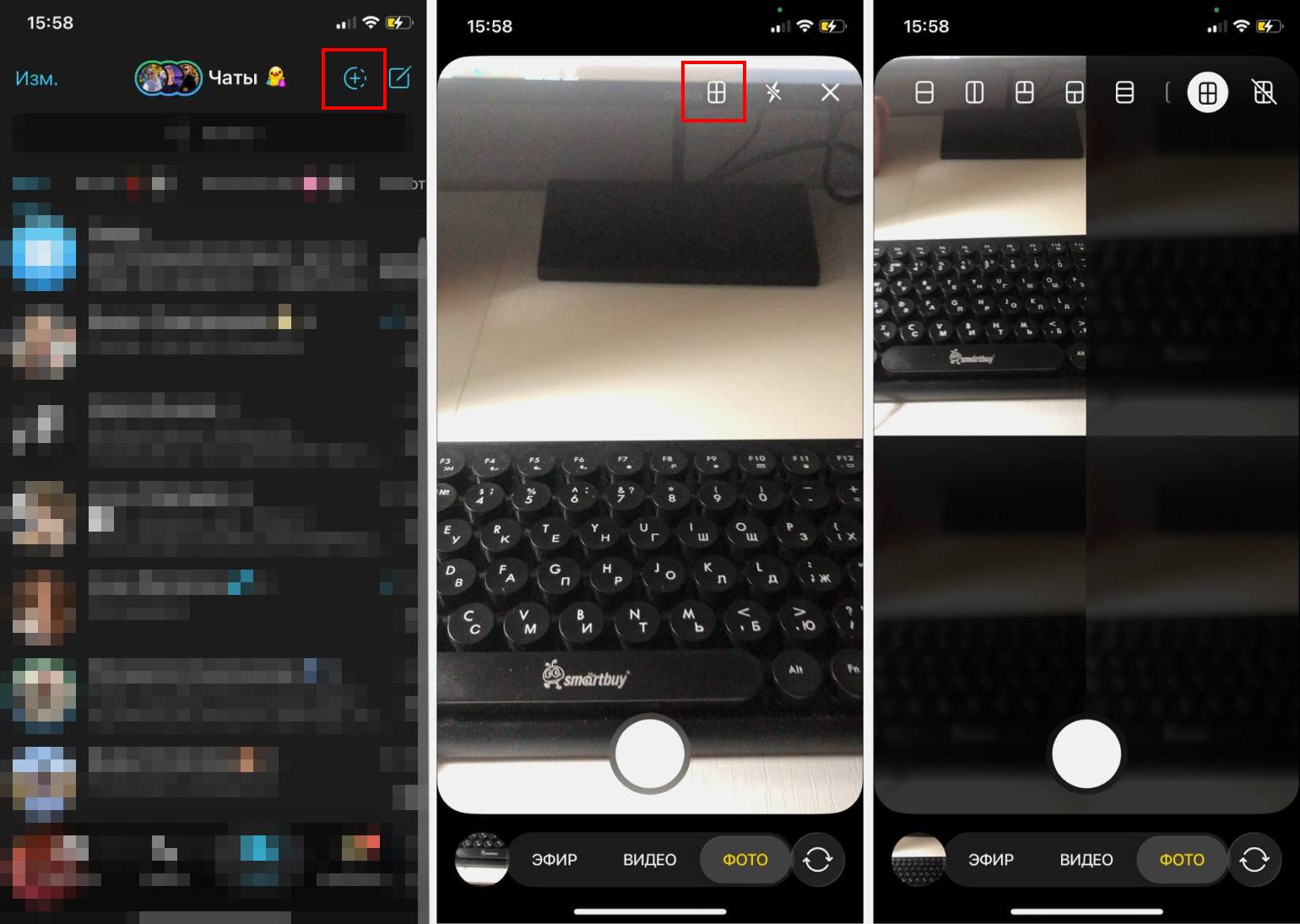 Telegram. В Telegram сделать коллаж можно прямо в сторис. Для начала нажмите на значок создания сторис. В верхней части экрана выберите значок сетки — это режим коллажа. Появится шаблон: можно сразу сделать фото по нему или добавить в него изображения из галереи. При желании можно выбрать другой вариант сетки — они находятся в верхней части экрана.