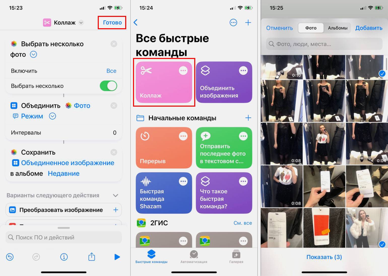 Простой коллаж из фотографий или иллюстраций можно собрать с помощью встроенного приложения «Команды» на iPhone. В нём можно настроить команду, объединяющую выбранные фото в коллаж в пару кликов.