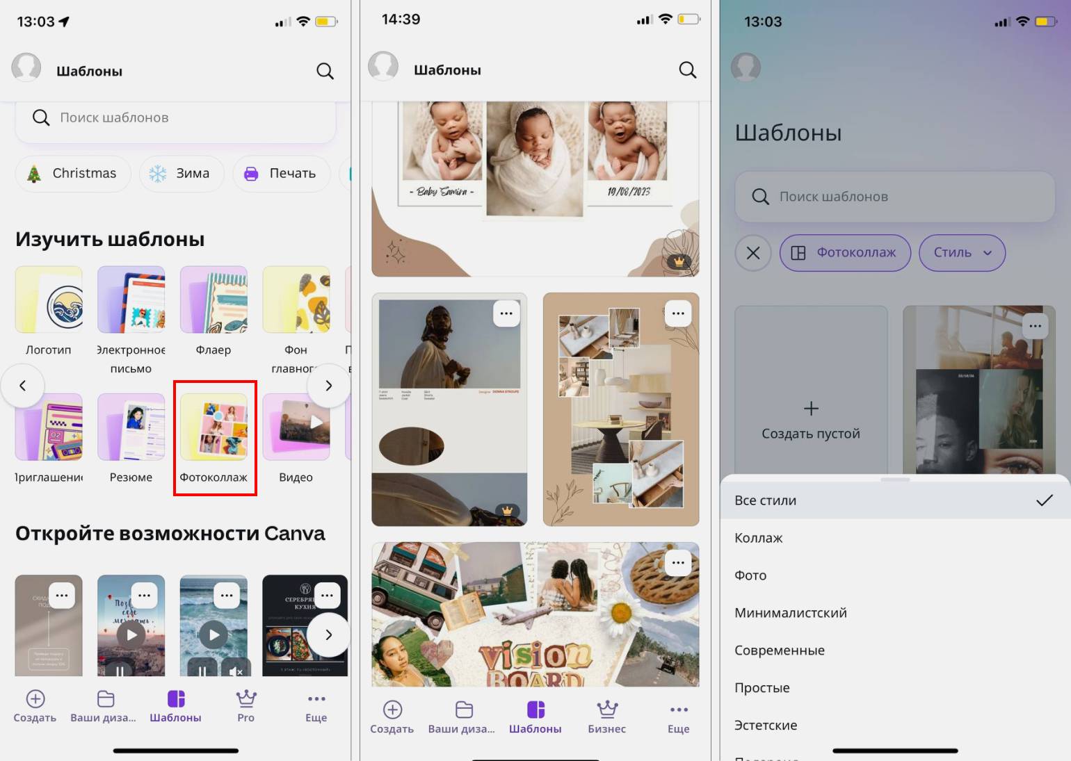 Canva. В сервисе есть специальный шаблон для коллажей, он называется «Фотоколлаж». Находим его среди шаблонов и нажимаем. После этого появится каталог готовых вариантов: можно выбрать один из образцов или собрать коллаж с нуля. Разберём сначала вариант с шаблоном.