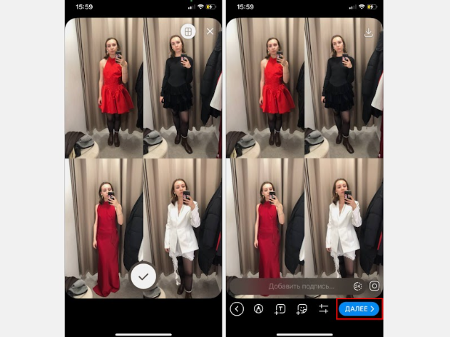 Чтобы загрузить фото из галереи, нажмите на кружок слева. Когда все нужные снимки будут добавлены, нажмите на галочку. После этого откроется меню редактирования коллажа. Если всё готово, нажмите на кнопку «Далее».