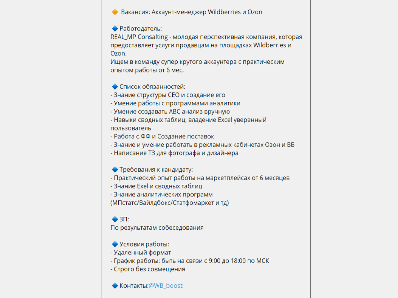 Ещё один источник — телеграм-чаты с вакансиями для менеджеров маркетплейсов. Там чаще ищут специалистов с опытом, но встречаются и предложения для новичков, требующие, например, 3–6 месяцев практики.