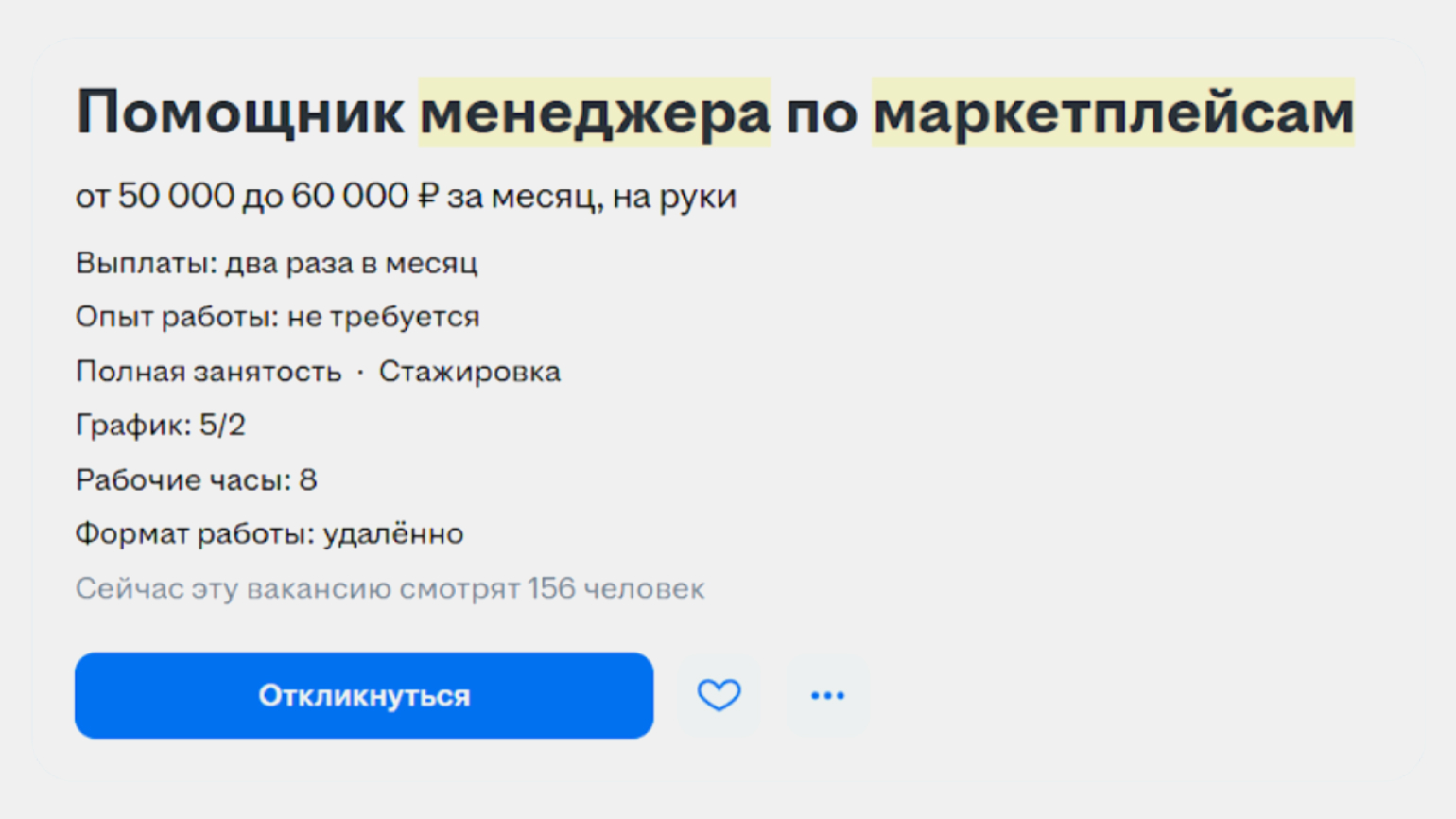 Вскоре на hh.ru стали появляться вакансии «специалист по работе с маркетплейсами» и «project manager по работе с маркетплейсами» с зарплатами 150–200 тысяч рублей в месяц. На тот момент я получал 90 тысяч, и, когда руководство отказалось повысить доход, начал искать новое место. Оказалось, что рынок очень узкий: все менеджеры знали друг друга и даже обменивались вакансиями.
