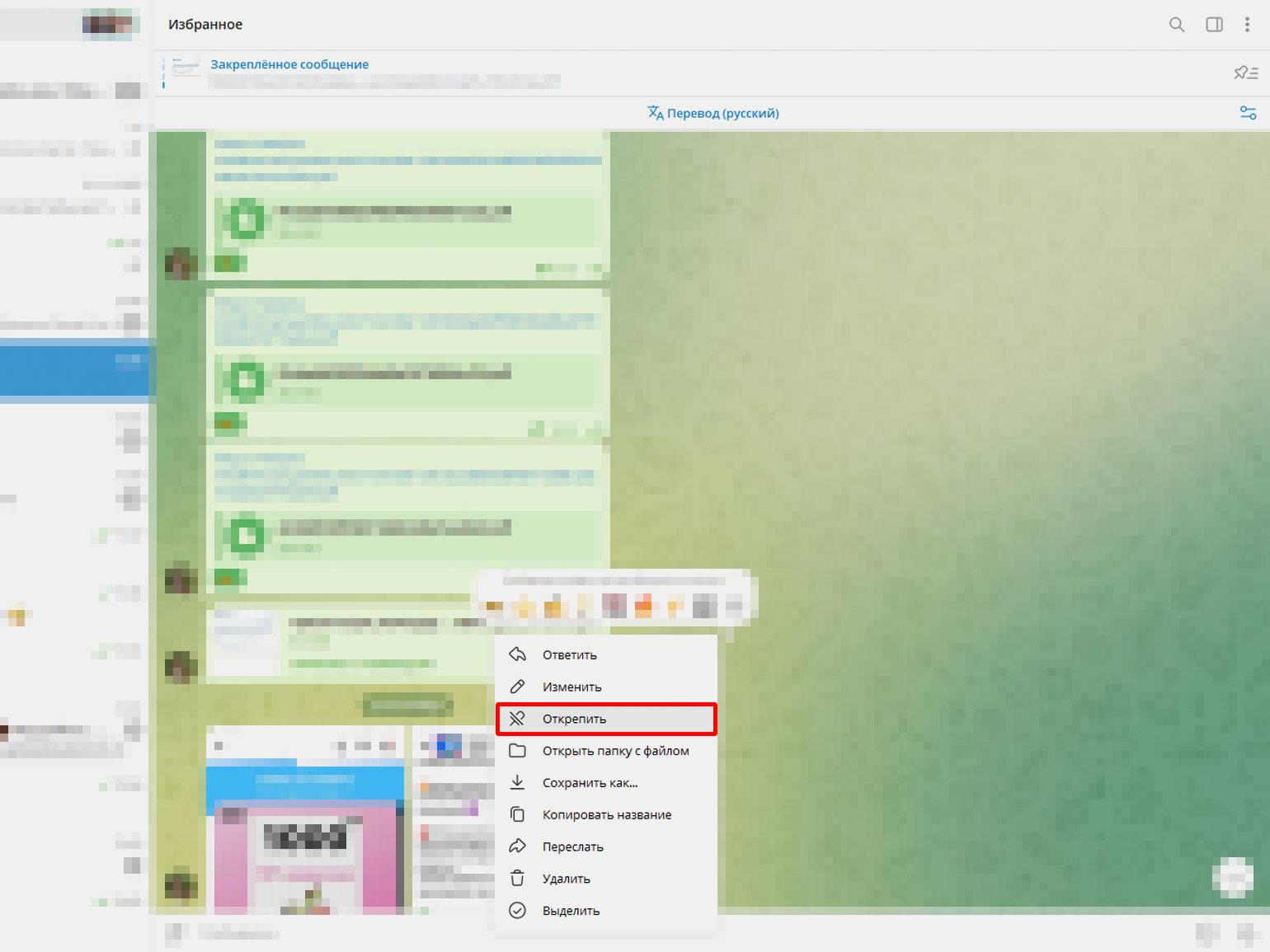 Если в чате или группе закреплено несколько сообщений, открепить нужное можно двумя способами. Первый способ — кликать по списку закреплённых сообщений, пока не долистаете до нужного сообщения. Далее нужно кликнуть по нему правой кнопкой мыши и выбрать во всплывающем меню пункт «Открепить», или «Unpin». Сообщение пропадёт из списка.
