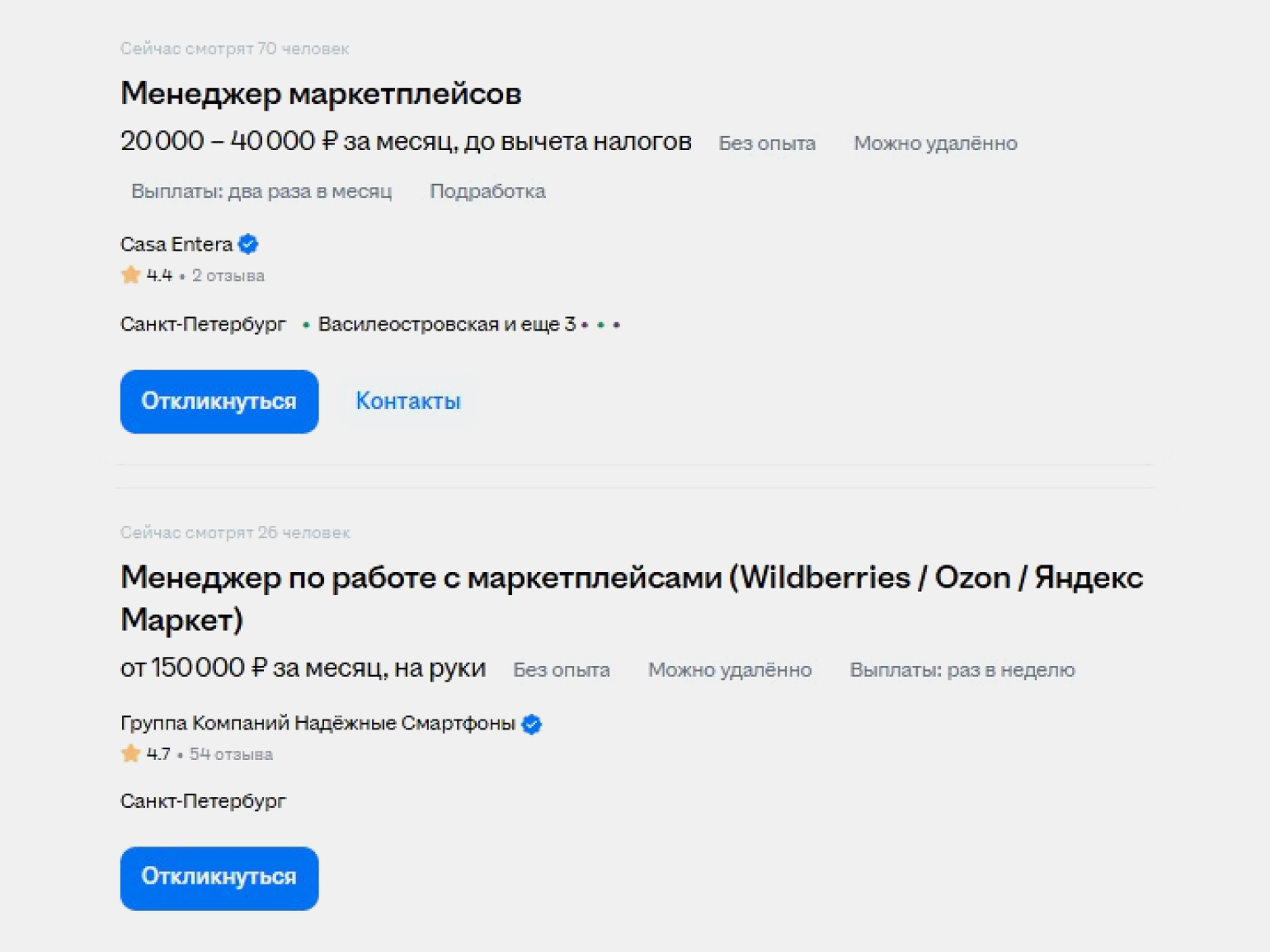 Размер зарплаты специалистов зависит от масштаба компании, должностных обязанностей, уровня ответственности, размера бонусной части и графика работы. В отрасли продаж на маркетплейсах можно найти и работу на несколько часов в неделю — и получать за неё 40–50 тысяч рублей в месяц, и работу на полный день, связанную с управлением большим ассортиментом товаров, — и получать за неё 200 тысяч рублей в месяц.