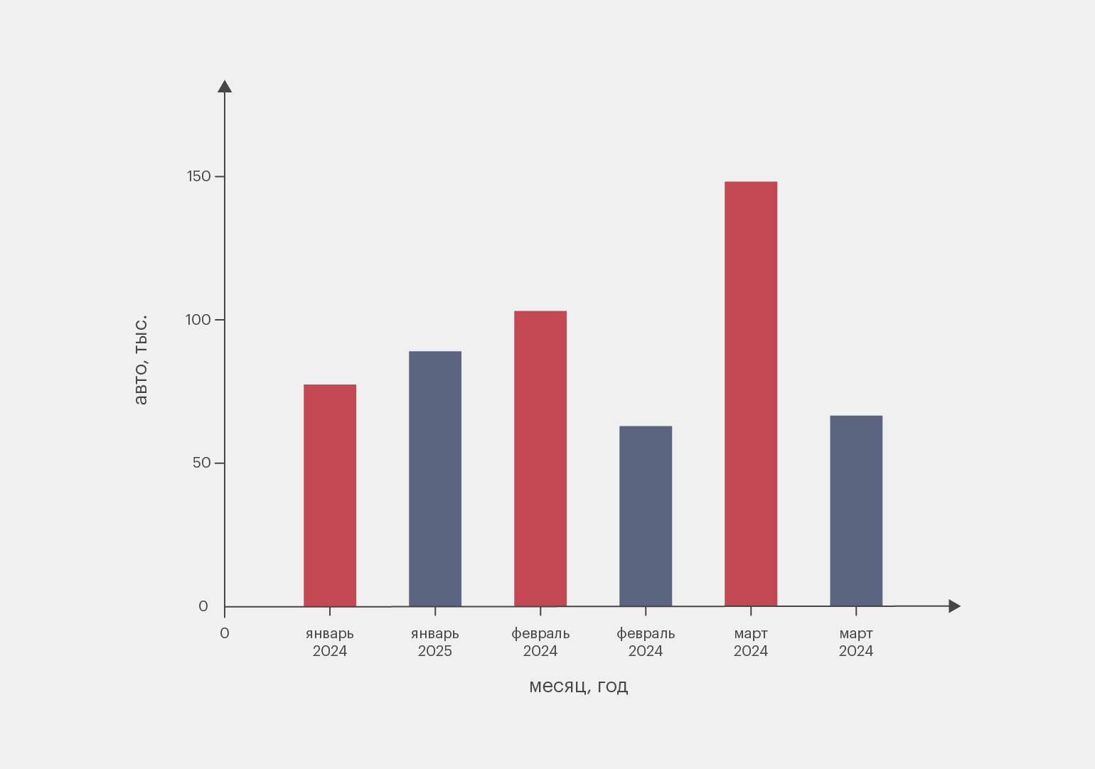 Ниже представлен график, сравнивающий объёмы продаж новых автомобилей в России в период с января по март в 2024 и 2025 году. Снижение продаж в 2025-м при сопоставимых ценовых условиях как раз отражает влияние неценовых факторов, которые в том числе повлияли на предложение.