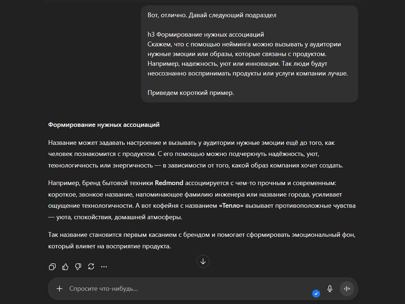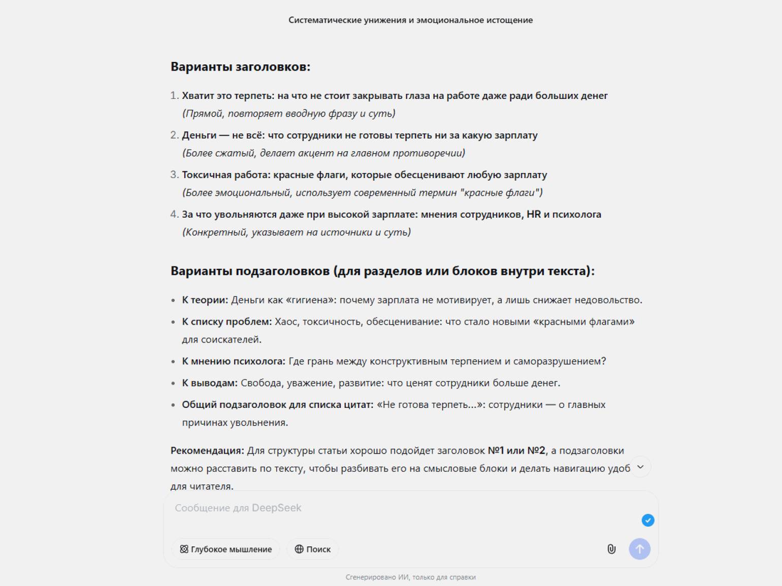 В остальном DeepSeek работает примерно в том же диапазоне задач, что и ChatGPT: может помочь разобраться в особенностях целевой аудитории, собрать черновик и структуру материала, сформулировать вопросы для интервью, доработать текст и предложить варианты заголовков и подзаголовков.