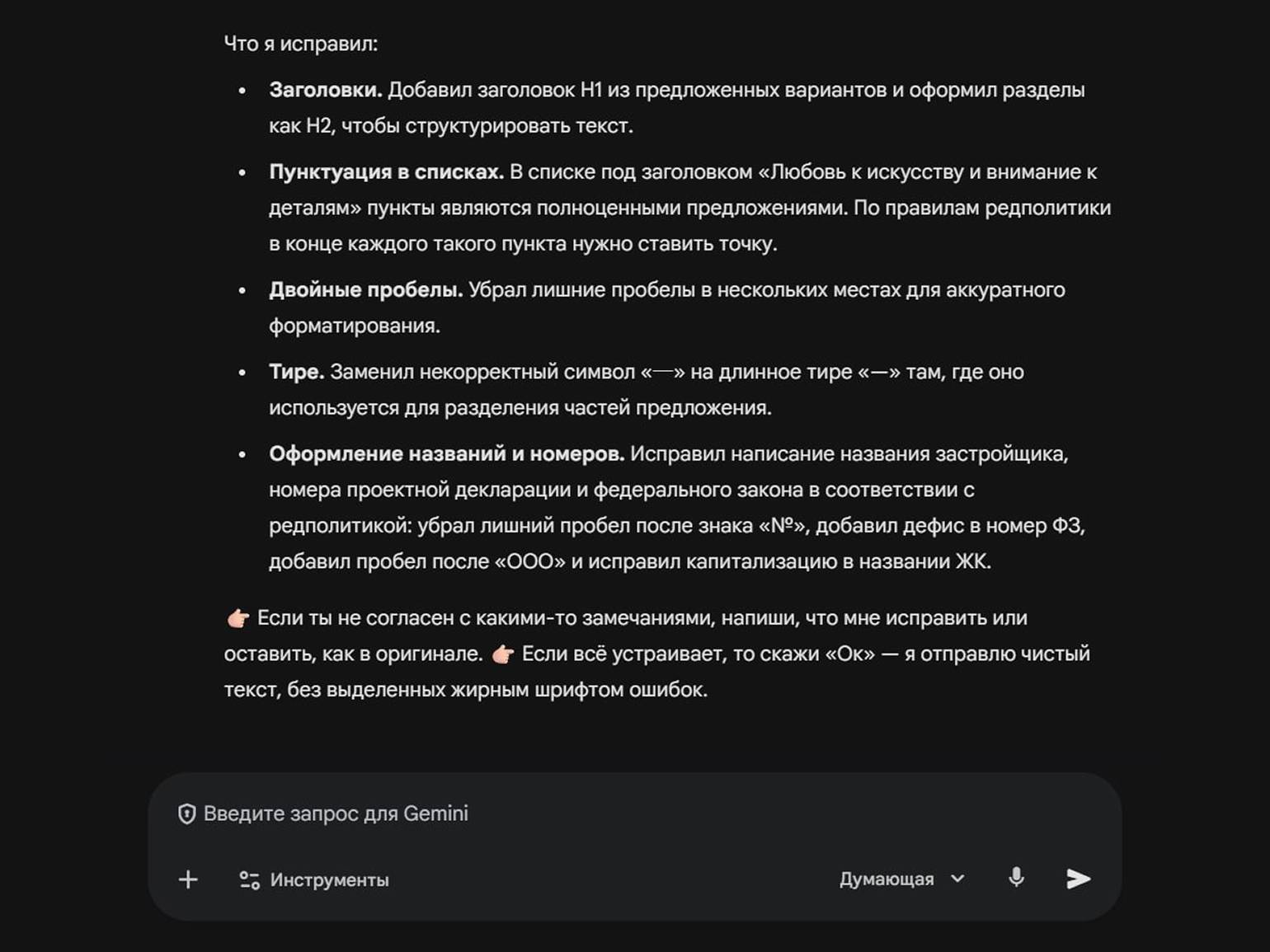 Редактирование и проверка текста. Многие авторы и редакторы отмечают, что современные ИИ-сервисы хорошо справляются с вычиткой. Достаточно задать нужные параметры в промпте — например, попросить нейросеть найти канцеляризмы или слова, которых лучше избегать в коммерческом тексте, — и ИИ быстро подсветит всё лишнее.