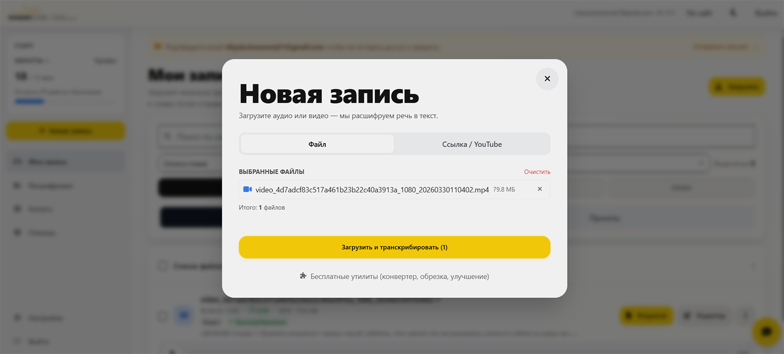 Рекомендуем зарегистрироваться на сервисе через почту (после загрузки или перед ней). Хоть на сайте и указано, что можно протестировать сервис без регистрации, в нашем случае ничего не получилось — после загрузки файла началась его бесконечная обработка, которая длилась примерно час. А вот после авторизации в личном кабинете сразу появилась нужная расшифровка.