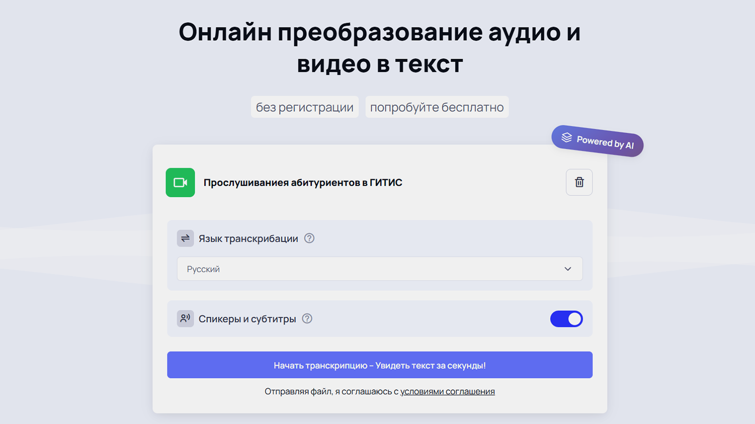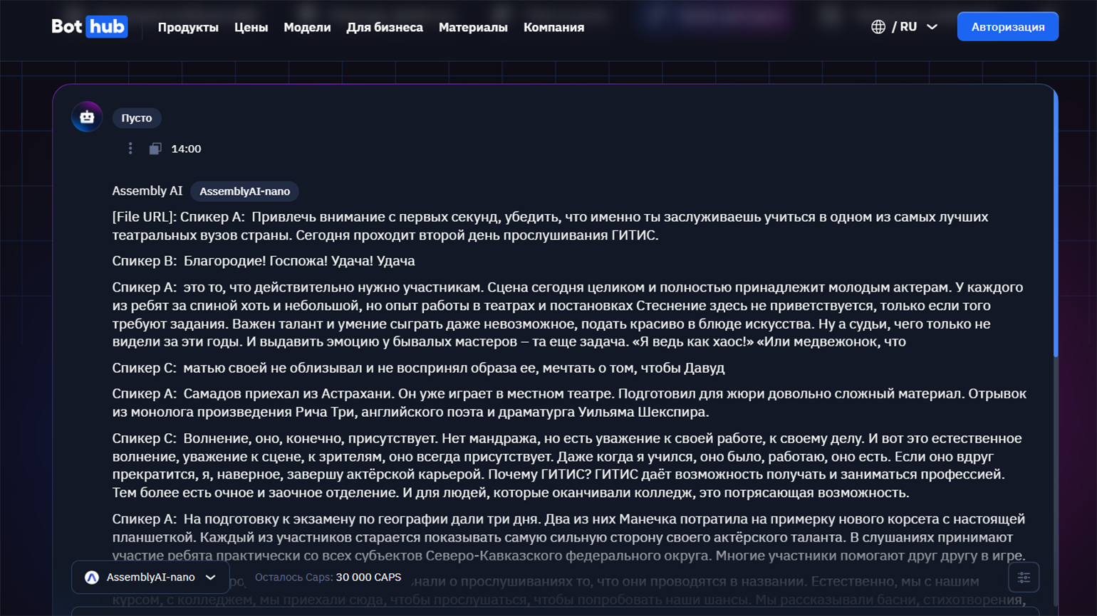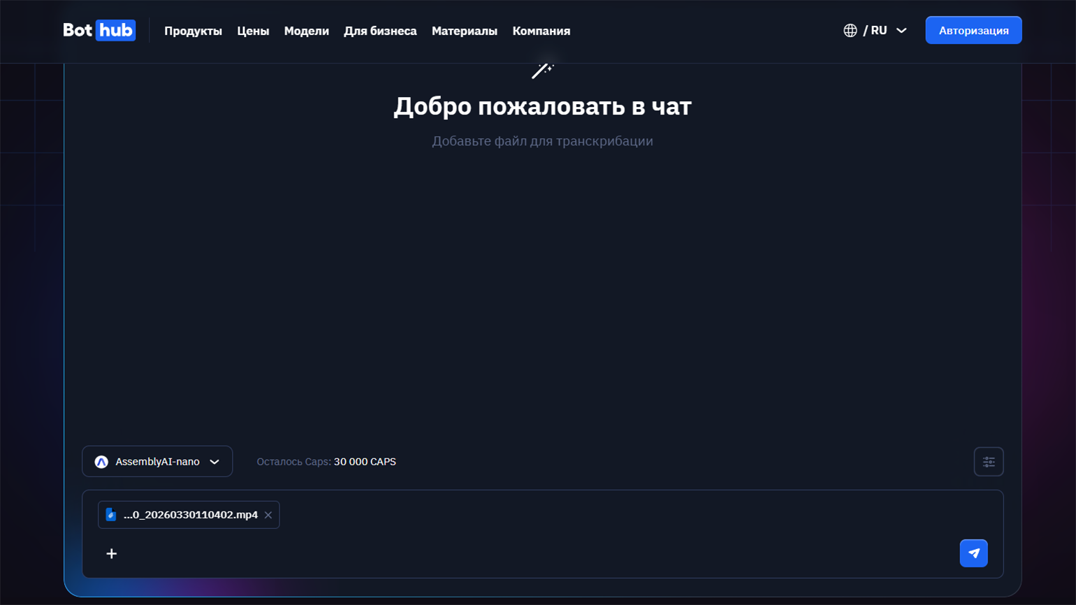 Сервис BotHub — это платформа с разными ИИ-инструментами, среди которых есть функция транскрибации аудио. Воспользоваться пробной версией можно без регистрации.