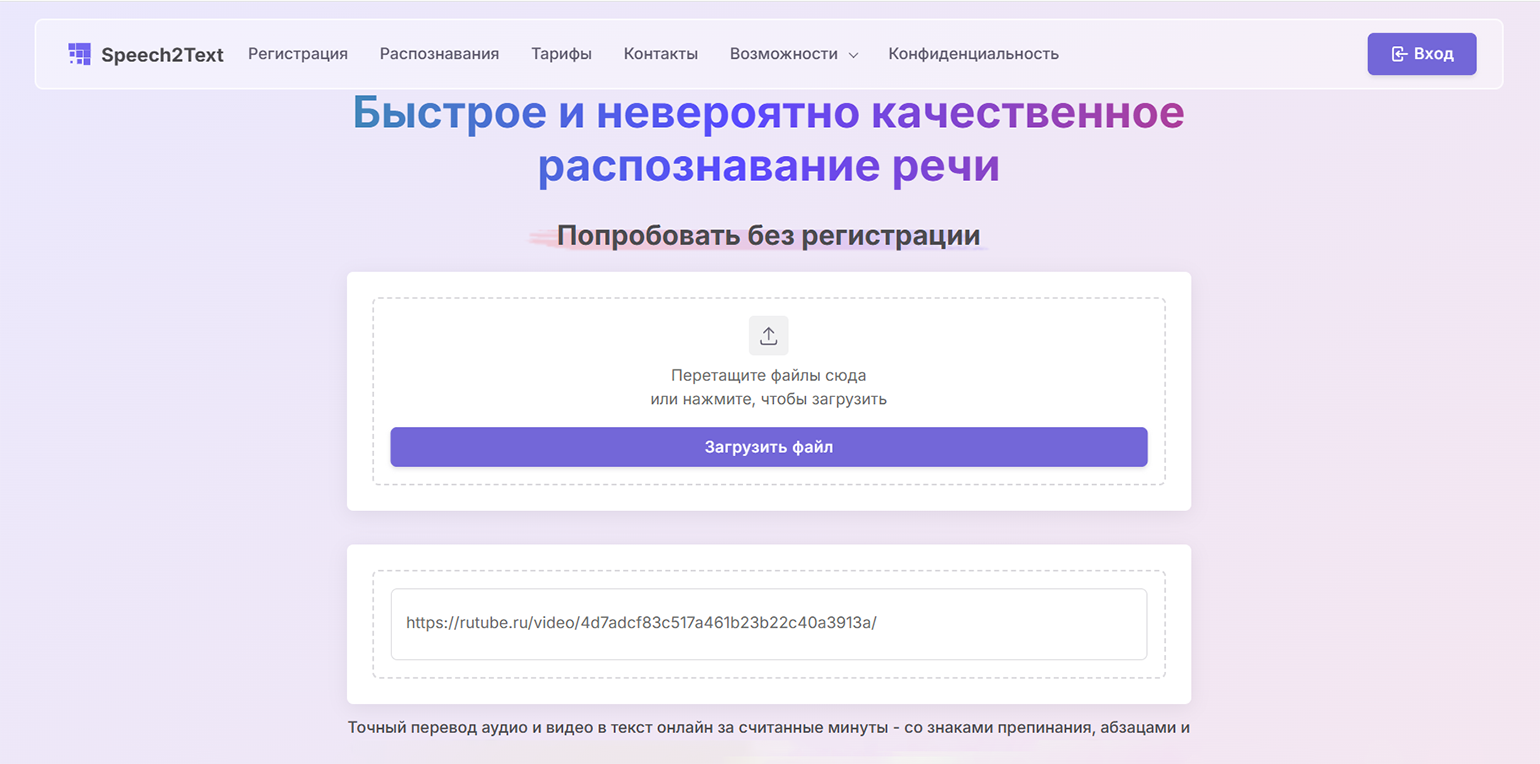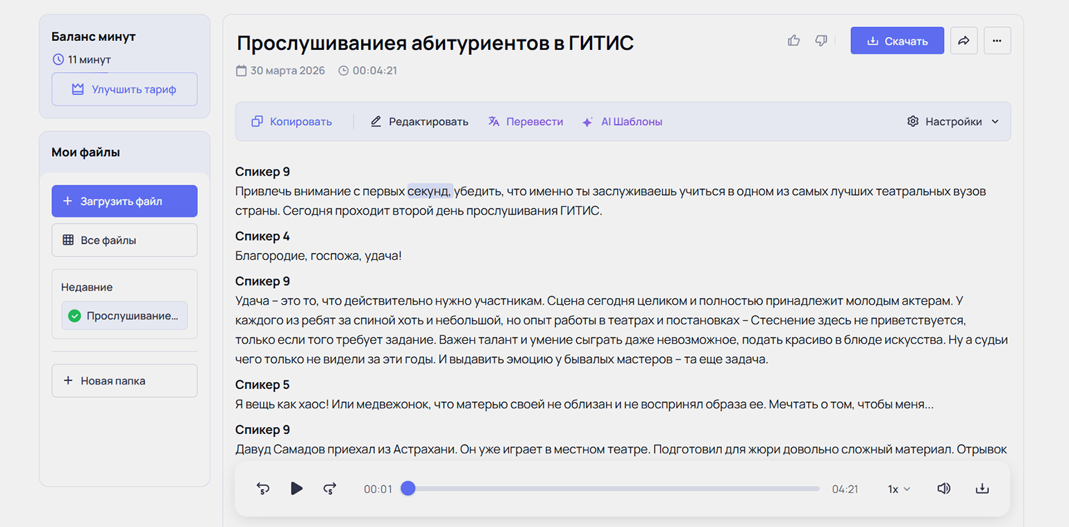 Текст доступен в интерфейсе сразу после обработки, без отдельного редактора или скачивания файла. Готовую расшифровку можно скопировать или предварительно отредактировать.