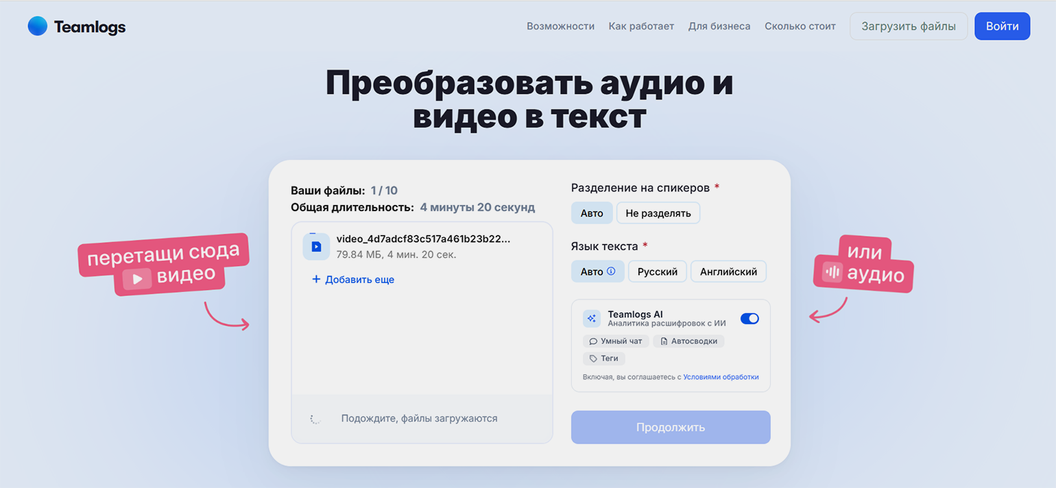 Сервис Teamlogs принимает файлы MP3, MP4, M4A, OGG, WAV, FLAC, WMA, M4A, FLAC, AAC, WEBM. Загрузить файл по ссылке нельзя. Для получения расшифровки нужно зарегистрироваться в сервисе с помощью почты или аккаунта «ВКонтакте».
