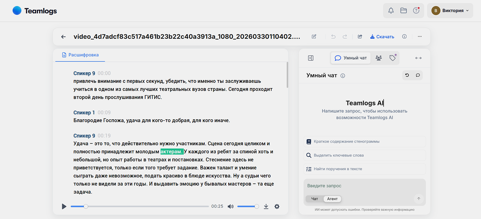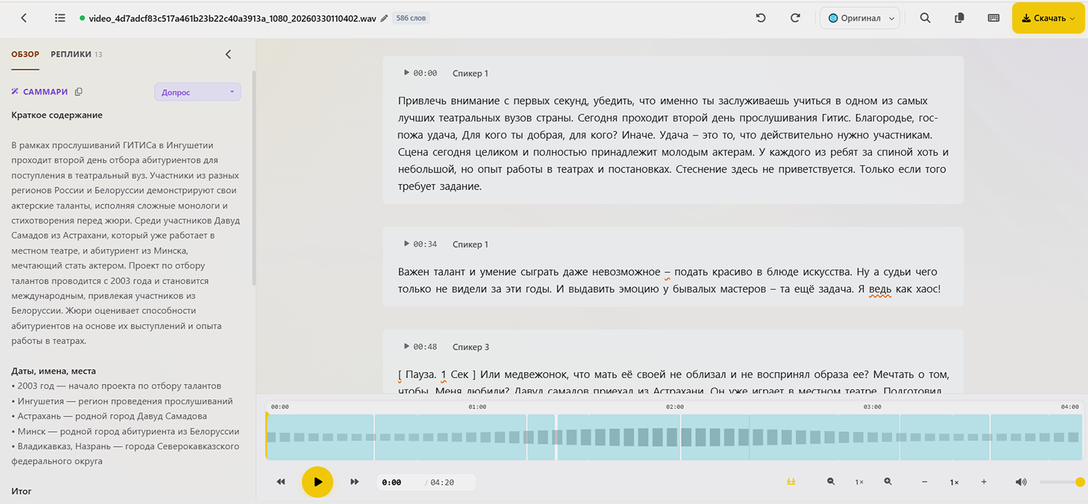 Как выглядит расшифровка. После обработки пользователь получает текст во встроенном интерактивном редакторе. Редактор синхронизирован с записью — можно прослушивать аудио и сразу вносить правки в нужных местах. Готовую расшифровку можно экспортировать в разных форматах: поддерживаются DOCX, PDF, а также формат субтитров SRT.