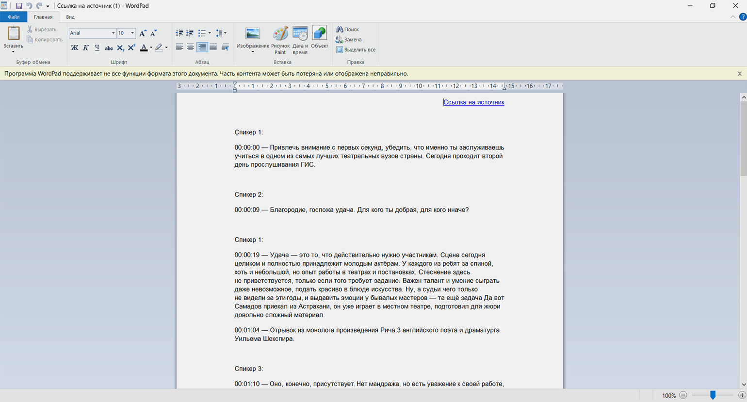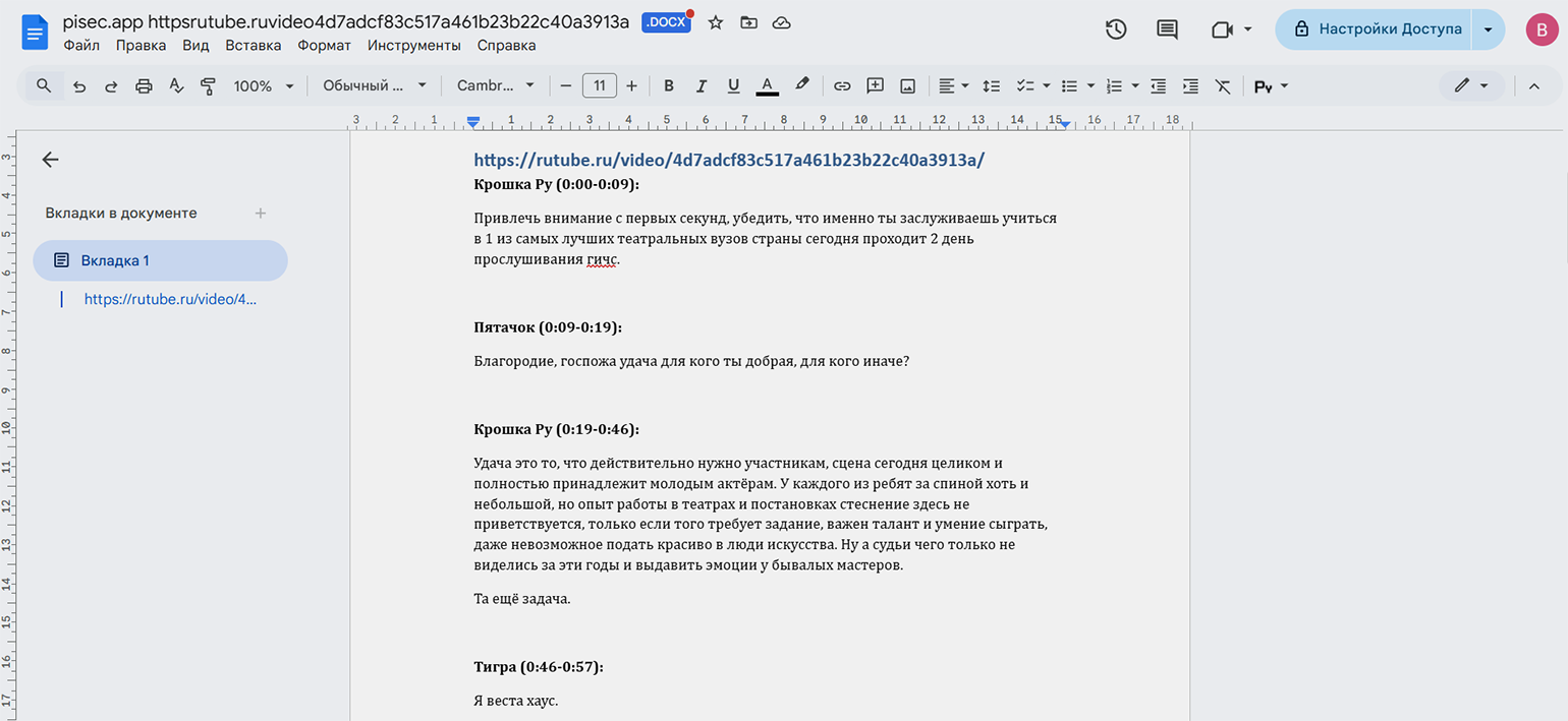 Как выглядит расшифровка. Файл в формате DOCS приходит на почту — предварительно посмотреть его и внести правки нельзя. Сервис самостоятельно разбивает речь на реплики спикеров. Есть таймкоды.